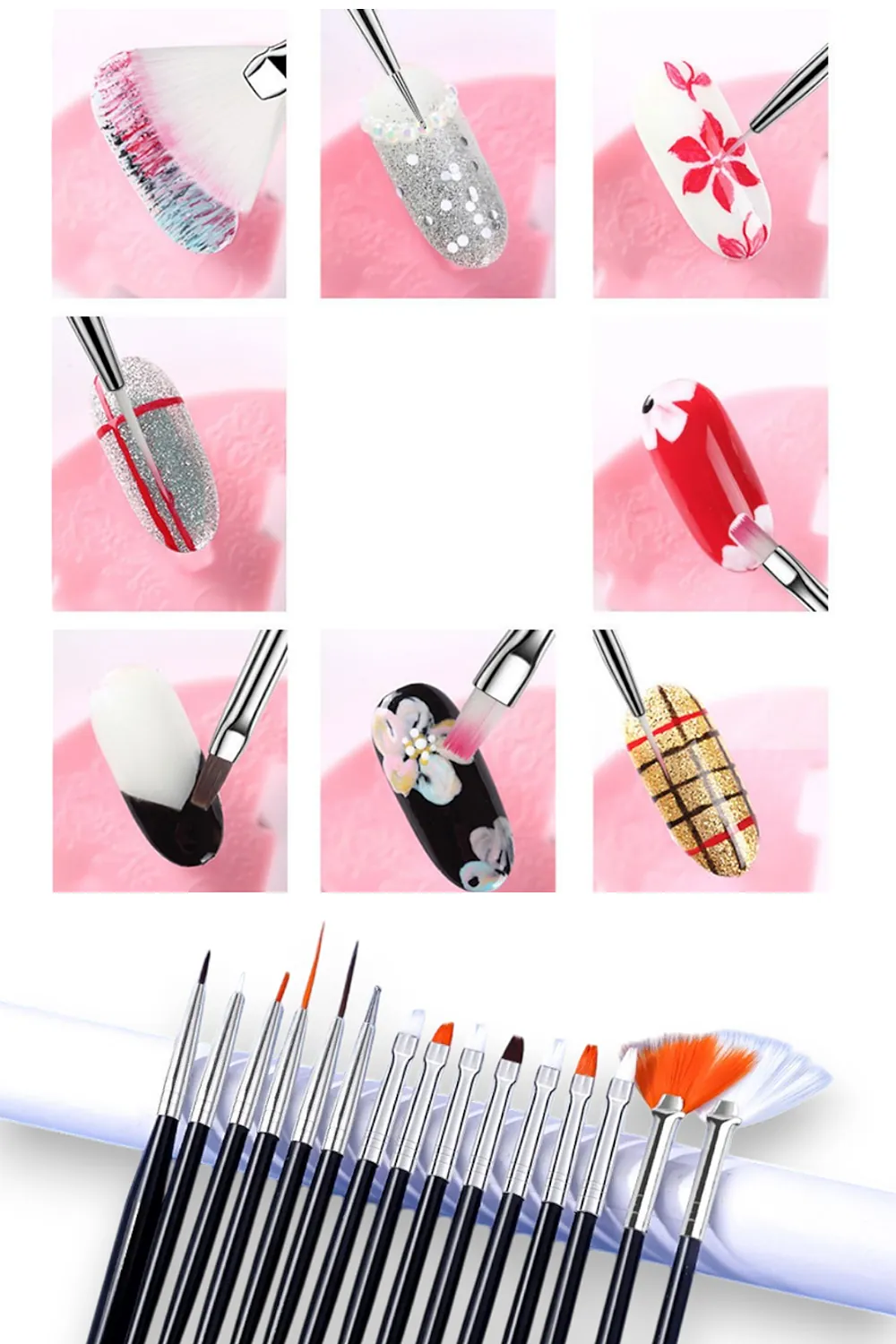 15 Adet Nail Art Dizayn Ve Jel Fırça Seti Tırnak Süsleme Fırça Seti-Pembe