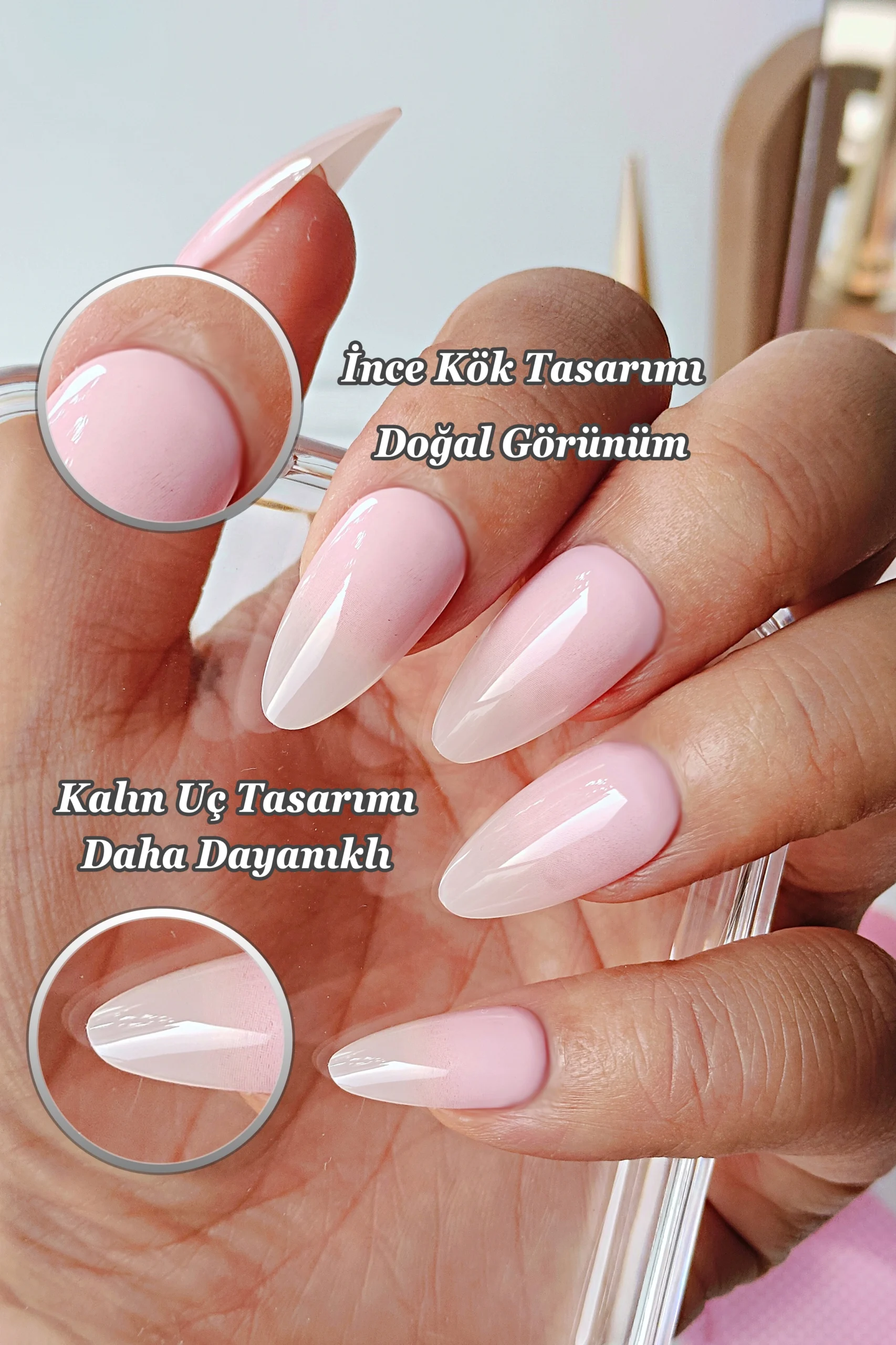 [Akıllı Tasarım] Tırnakların kök tarafının ince dizaynı sayesinde gerçek tırnağa yakın bir görünüm elde edersiniz. Tırnak ucunun kalın olması sayesinde ise Easy Beauty tırnaklar daha sağlamdır ve kolay kolay kırılmaz veya çatlamaz.