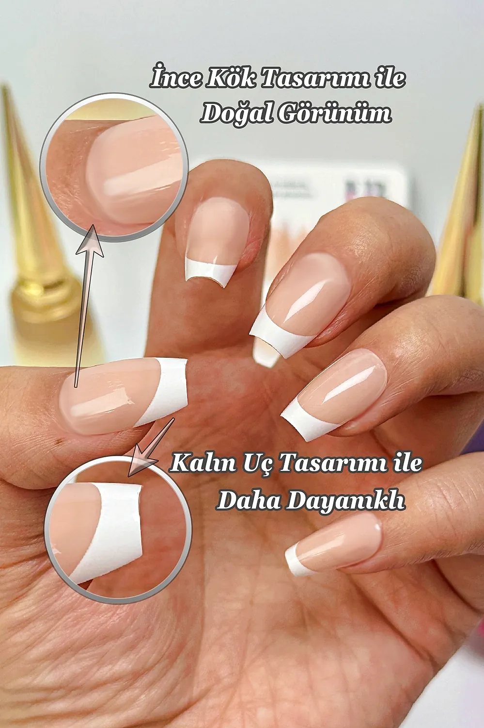 [Akıllı Tasarım] Tırnakların kök tarafının ince dizaynı sayesinde gerçek tırnağa yakın bir görünüm elde edersiniz. Tırnak ucunun kalın olması sayesinde ise Easy Beauty tırnaklar daha sağlamdır ve kolay kolay kırılmaz veya çatlamaz.