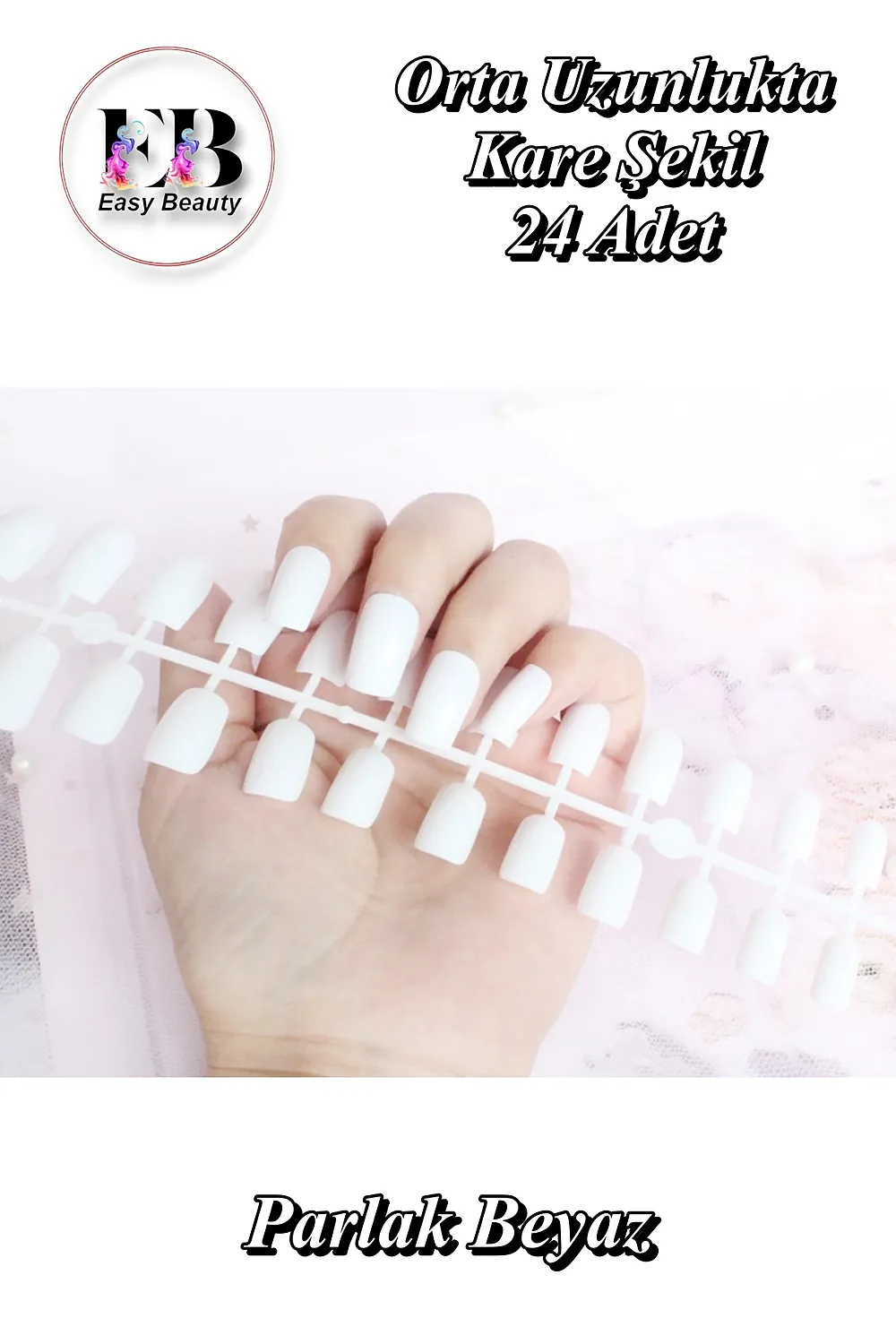 ÖNEMLİ NOT: Takma tırnaklarınızı kullanmadan önce MUTLAKA TOP COAT uygulamanızı tavsiye ederiz; Burada gördüğünüz renklendirilmiş takma tırnak setleri nail art (tırnak süsleme sanatı) için de kullanılabilmektedir; Bu nedenle üzerlerinde koruyucu bir tabaka bulunmamaktadır; Buradaki tırnakları istediğiniz gibi dizayn edebilirsiniz; Eğer olduğu gibi, hiç bir değişiklik yapmadan kullanmak istiyorsanız, belirttiğimiz gibi renklerin solmaması veya çıkmaması için koruyucu katman olarak top coat sürünüz ve Easy Beauty takma tırnaklarınızı en özel günlerinizde keyifle kullanın; [Paket İçeriği] Farklı şekillerde ve farklı uzunluklarda sunulan bu takma tırnaklar plastik paket içerisinde 24 adet olarak sunulmaktadır; Sıkça Sorunlan Sorular: Çocuklar kullanabilir mi? Cilde zarar vermeyen yapıştırıcı alarak Easy Beauty takma tırnakları çocuklarınızın da kullanmasına izin verebilirsiniz; Üzerine oje sürülebilir mi? Evet takma tırnağınızın üzerine oje sürebilirsiniz; Hiç bir sakıncası yoktur; Kutusu var mı? Renkli takma tırnaklarınız plastik paket içerisinde kargo edilecektir; İçerisinde 24 adet çeşitli boylarda renkli takma tırnak vardır; Her tırnağa uyar mı? Şekil verebilir miyim? Paket içerisinde 24 adet tırnak gönderilecektir; 12 tırnak boyutu vardır; Genel olarak bütün tırnaklara uyacaktır; Büyük gelen tırnakları törpü ile tırnağınıza uygun hale getirebilirsiniz; Tırnaklar farklı şekillerde ve uzunlukta sunulmaktadır; Eğer şeklini veya uzunluğu beğenmezseniz törpü ile istediğiniz gibi ayarlayabilirsiniz; Takma tırnak neden atar?; Uygulama esnasında tırnağınız ile takma tırnak arasında herhangi bir toz veya boşluk kalması durumunda takma tırnak kısa zamanda atabilir; Tırnağınıza uygun olmayan (küçük veya büyük) cilde zarar vermeyen yapıştırıcı kullanır iseniz veya yapıştırıcı ile turnağınız arasında boşluk kalır ise takma tırnağınız atabilir; Sıvı yapıştırıcının gereğinden az uygulanması durumunda takma tırnağınız atabilir; Yapıştırıcıların hepsi sıcak suda özelliklerini yitirir; Bu nedenle elleriniz sıcak suda uzun süre kaldı ise (banyo, bulaşık) sonraki bir iki saat tırnaklarınızı korumanız ve zorlamamanız gerekmektedir; Aksi durumda tırnağınız atabilir; Uygulama esnasında tırnak yüzeyinin törpülenmemesi, alkolle tırnak üzerindeki yağın temizlenmemesi, tırnak etlerinin düzgün şekilde ittirilmenesi takma tırnağın atmasına sebep olabilir;