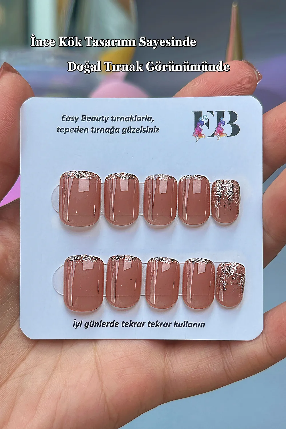 [Alternatif Uygulama] Eğer Easy Beauty tırnakları çok uzun süreli kullanmak istiyorsanız sıvı yapıştırıcı ile kendi sorumluluğunuzda kullanabilirsiniz. KUTU İÇERİSİNDE SADECE CİLDE ZARAR VERMEYEN ÇİFT TARAFLI YAPIŞTIRICI VARDIR. SIVI YAPIŞTIRICI YOKTIR. Sıvı yapıştırıcı kullanıldığında tırnaklar çıkarılırken büyük oranda kırılmalar olabilmektedir. Bu nedenle çift taraflı yapıştırıcılar çok daha kullanışlıdır. Sıvı yapıştırıcıyı cildinizle temas ettirmek istemiyorsanız, çift taraflı yapıştırıcıyı önce kendi tırnağınıza yapıştırıp, takiben sıvı yapıştırıcıyı takma tırnak içerisine uygulayabilirsiniz. Böylece hem tırnaklarınızı korumuş olursunuz hem de takma tırnaklarınızı daha uzun süre kullanabilirsiniz. Sıvı yapıştırıcı kullandığınızda tırnakların zarar görmemesi ve ileride tekrar kullanabilmeniz için çıkarırken mutlaka DİKKAT ETMENİZ gerekmektedir. Ellerinizi ılık suda en az 5 dakika bekleterek yapıştırıcının özelliğini kaybetmesini sağlayınız. Takiben portakal çubuğu ile tırnağın kenarlarından nazikçe ittirerek çıkartınız. Eğer çıkartırken zorlanırsanız tırnak kenarlarına bir miktar aseton sürüp bekleyiniz ve tekrar deneyiniz.