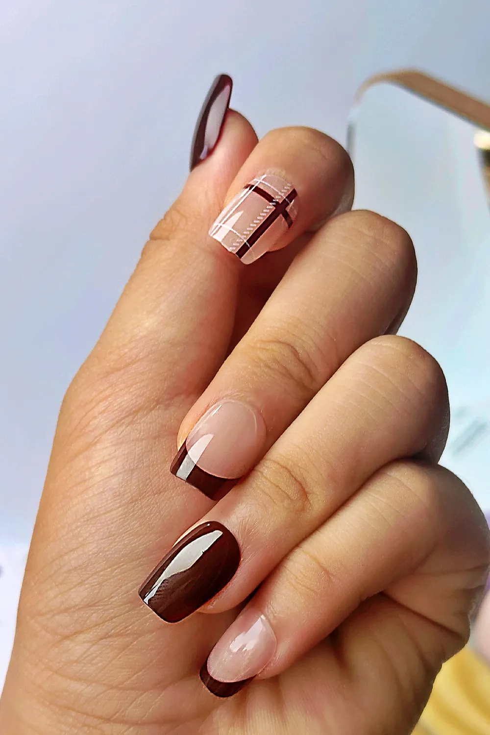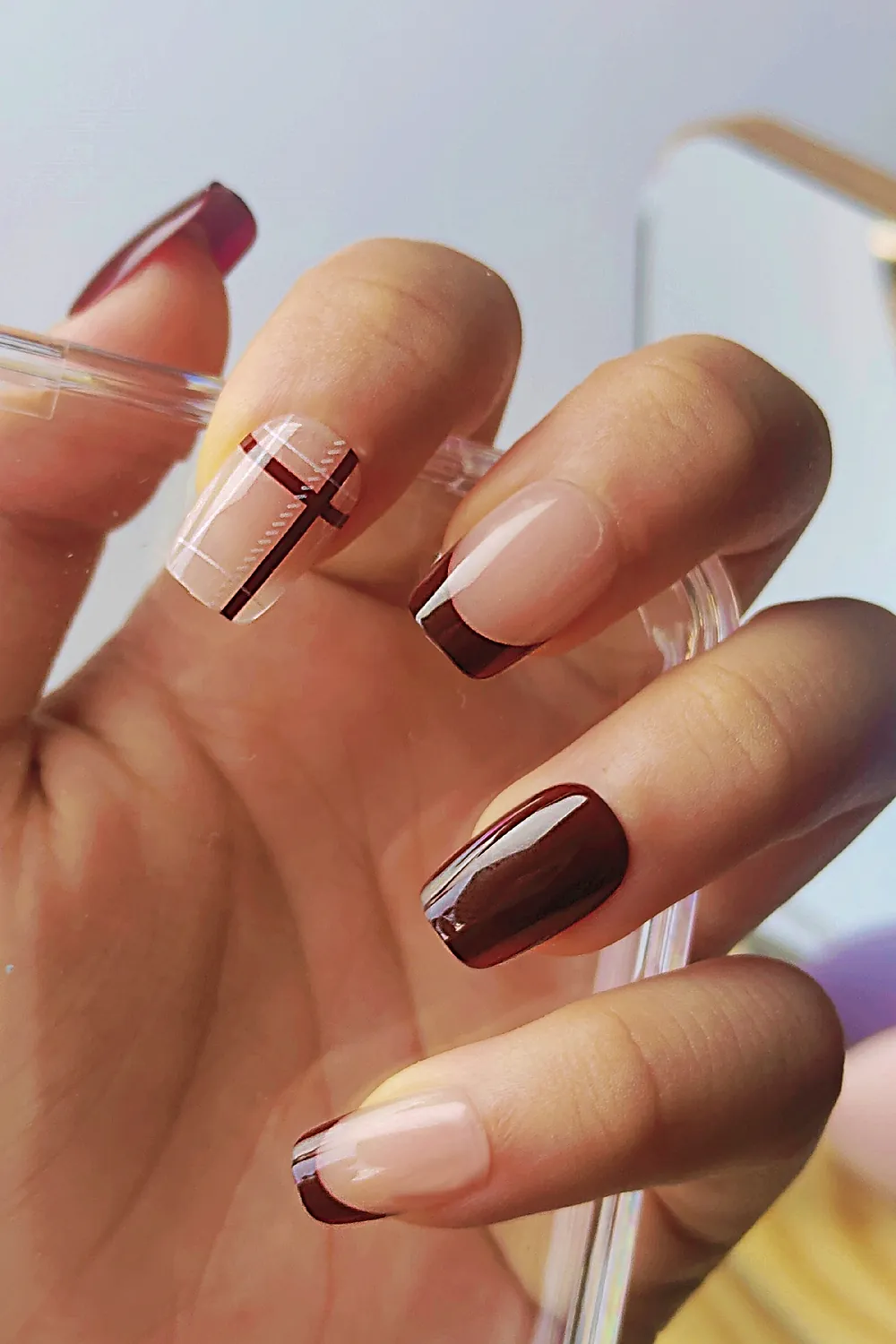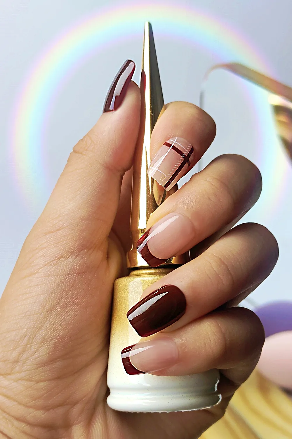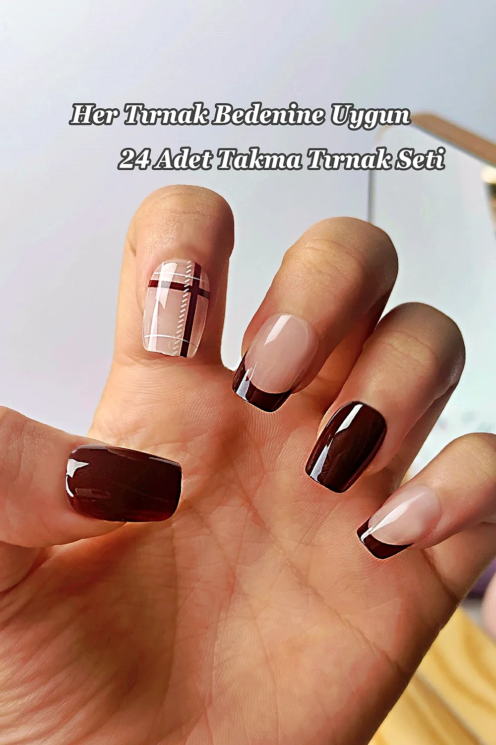 24 Adet Küt Takma Tırnak Seti Orta Uzun Bordo French Takma Tırnak DY917