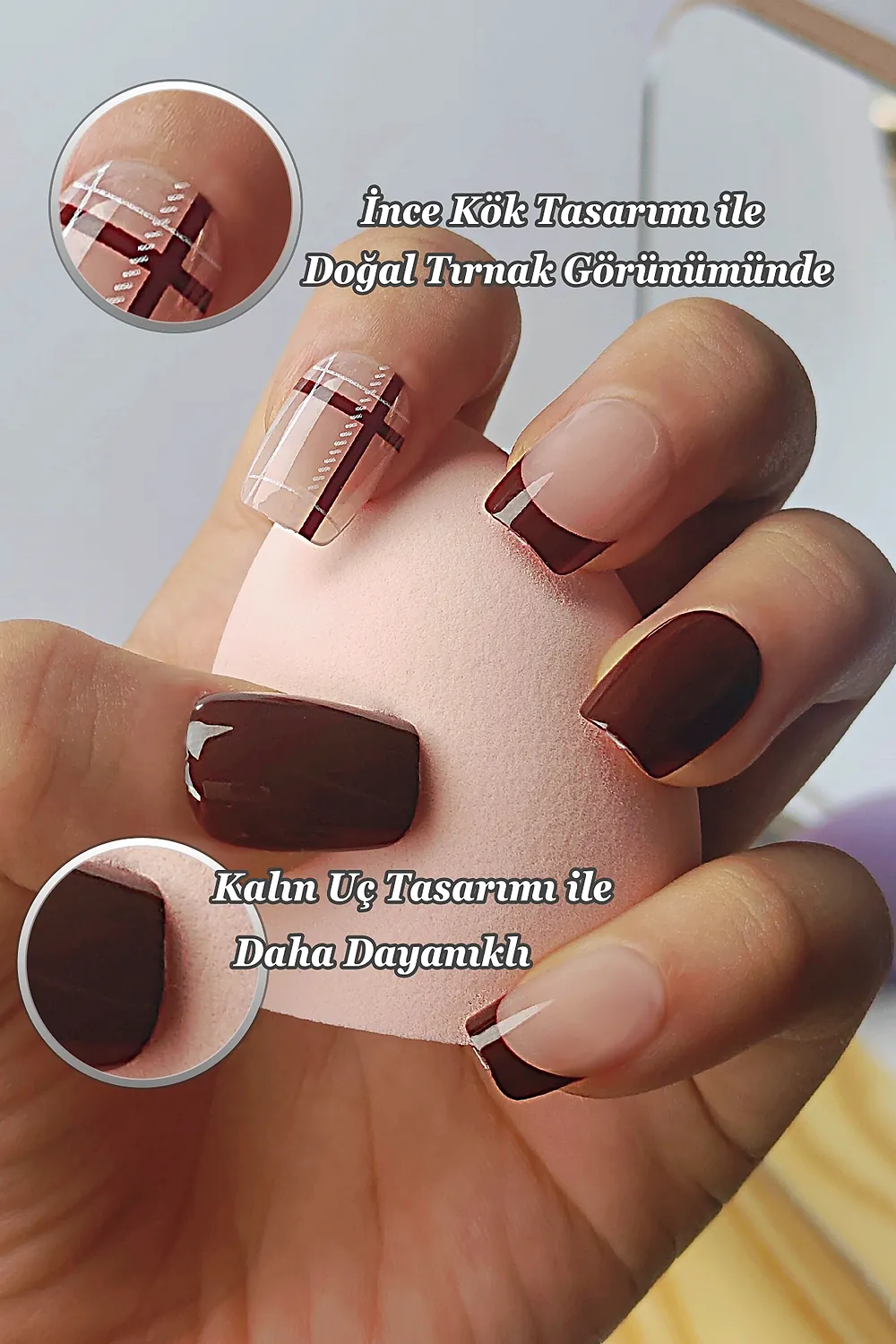 Kutu içerisinde 24 adet takma tırnak, 24 adet çift taraflı yapıştırıcı seti, manikür çubuğu (portakal çubuğu), mini törpü ve alkollü mendil bulunmaktadır.