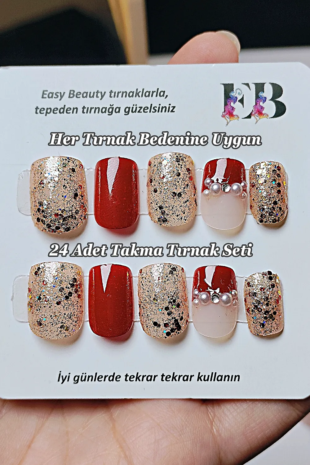 24 Adet Küt Takma Tırnak Seti Taşlı Ve Desenli Z538