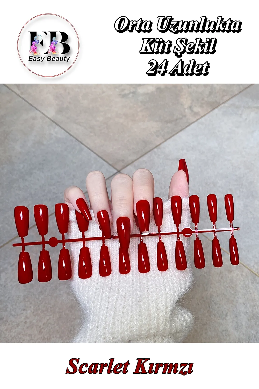 ÖNEMLİ NOT: Takma tırnaklarınızı kullanmadan önce MUTLAKA TOP COAT uygulamanızı tavsiye ederiz; Burada gördüğünüz renklendirilmiş takma tırnak setleri nail art (tırnak süsleme sanatı) için de kullanılabilmektedir; Bu nedenle üzerlerinde koruyucu bir tabaka bulunmamaktadır; Buradaki tırnakları istediğiniz gibi dizayn edebilirsiniz; Eğer olduğu gibi, hiç bir değişiklik yapmadan kullanmak istiyorsanız, belirttiğimiz gibi renklerin solmaması veya çıkmaması için koruyucu katman olarak top coat sürünüz ve Easy Beauty takma tırnaklarınızı en özel günlerinizde keyifle kullanın; [Paket İçeriği] Farklı şekillerde ve farklı uzunluklarda sunulan bu takma tırnaklar plastik paket içerisinde 24 adet olarak sunulmaktadır; Sıkça Sorunlan Sorular: Çocuklar kullanabilir mi? Cilde zarar vermeyen yapıştırıcı alarak Easy Beauty takma tırnakları çocuklarınızın da kullanmasına izin verebilirsiniz; Üzerine oje sürülebilir mi? Evet takma tırnağınızın üzerine oje sürebilirsiniz; Hiç bir sakıncası yoktur; Kutusu var mı? Renkli takma tırnaklarınız plastik paket içerisinde kargo edilecektir; İçerisinde 24 adet çeşitli boylarda renkli takma tırnak vardır; Her tırnağa uyar mı? Şekil verebilir miyim? Paket içerisinde 24 adet tırnak gönderilecektir; 12 tırnak boyutu vardır; Genel olarak bütün tırnaklara uyacaktır; Büyük gelen tırnakları törpü ile tırnağınıza uygun hale getirebilirsiniz; Tırnaklar farklı şekillerde ve uzunlukta sunulmaktadır; Eğer şeklini veya uzunluğu beğenmezseniz törpü ile istediğiniz gibi ayarlayabilirsiniz; Takma tırnak neden atar?; Uygulama esnasında tırnağınız ile takma tırnak arasında herhangi bir toz veya boşluk kalması durumunda takma tırnak kısa zamanda atabilir; Tırnağınıza uygun olmayan (küçük veya büyük) cilde zarar vermeyen yapıştırıcı kullanır iseniz veya yapıştırıcı ile turnağınız arasında boşluk kalır ise takma tırnağınız atabilir; Sıvı yapıştırıcının gereğinden az uygulanması durumunda takma tırnağınız atabilir; Yapıştırıcıların hepsi sıcak suda özelliklerini yitirir; Bu nedenle elleriniz sıcak suda uzun süre kaldı ise (banyo, bulaşık) sonraki bir iki saat tırnaklarınızı korumanız ve zorlamamanız gerekmektedir; Aksi durumda tırnağınız atabilir; Uygulama esnasında tırnak yüzeyinin törpülenmemesi, alkolle tırnak üzerindeki yağın temizlenmemesi, tırnak etlerinin düzgün şekilde ittirilmenesi takma tırnağın atmasına sebep olabilir;