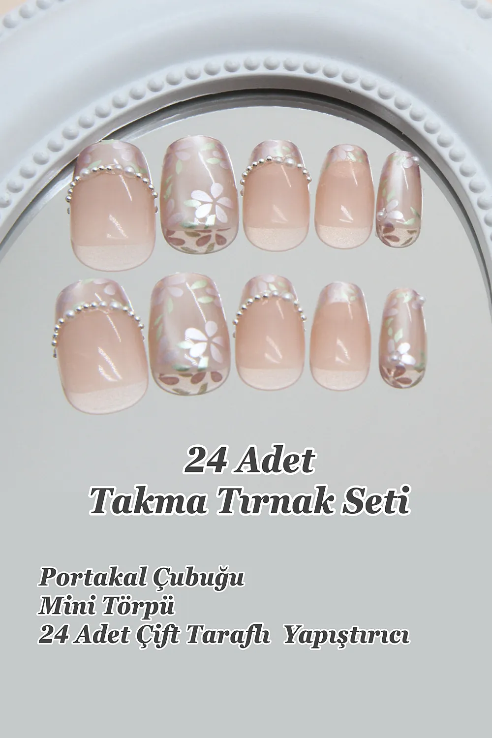 Kutu içerisinde 24 adet takma tırnak, 24 adet çift taraflı yapıştırıcı, manikür çubuğu (portakal çubuğu ve mini törpü bulunmaktadır.