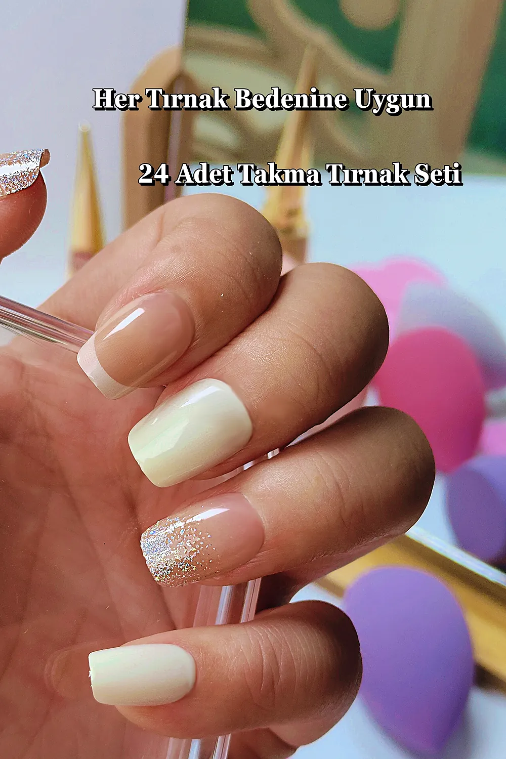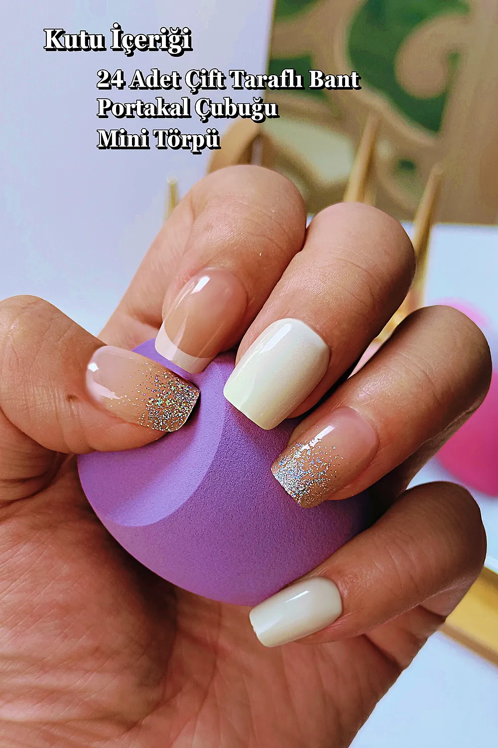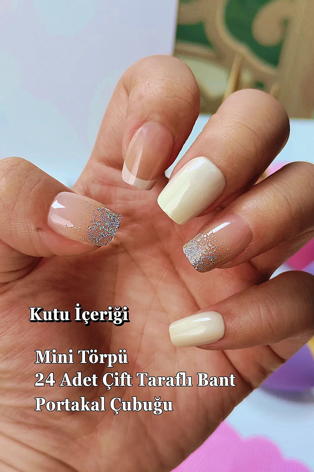 Kutu içerisinde 24 adet takma tırnak, 24 adet çift taraflı yapıştırıcı, manikür çubuğu (portakal çubuğu ve mini törpü bulunmaktadır.