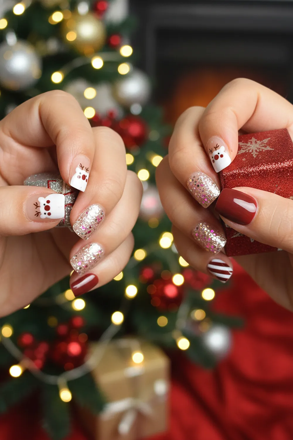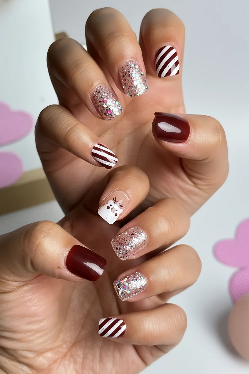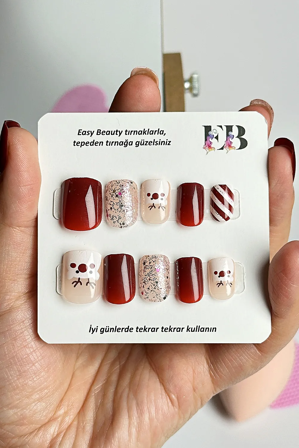 24 Adet Yılbaşı Desenli Kırmızı Kısa Takma Tırnak Seti R618