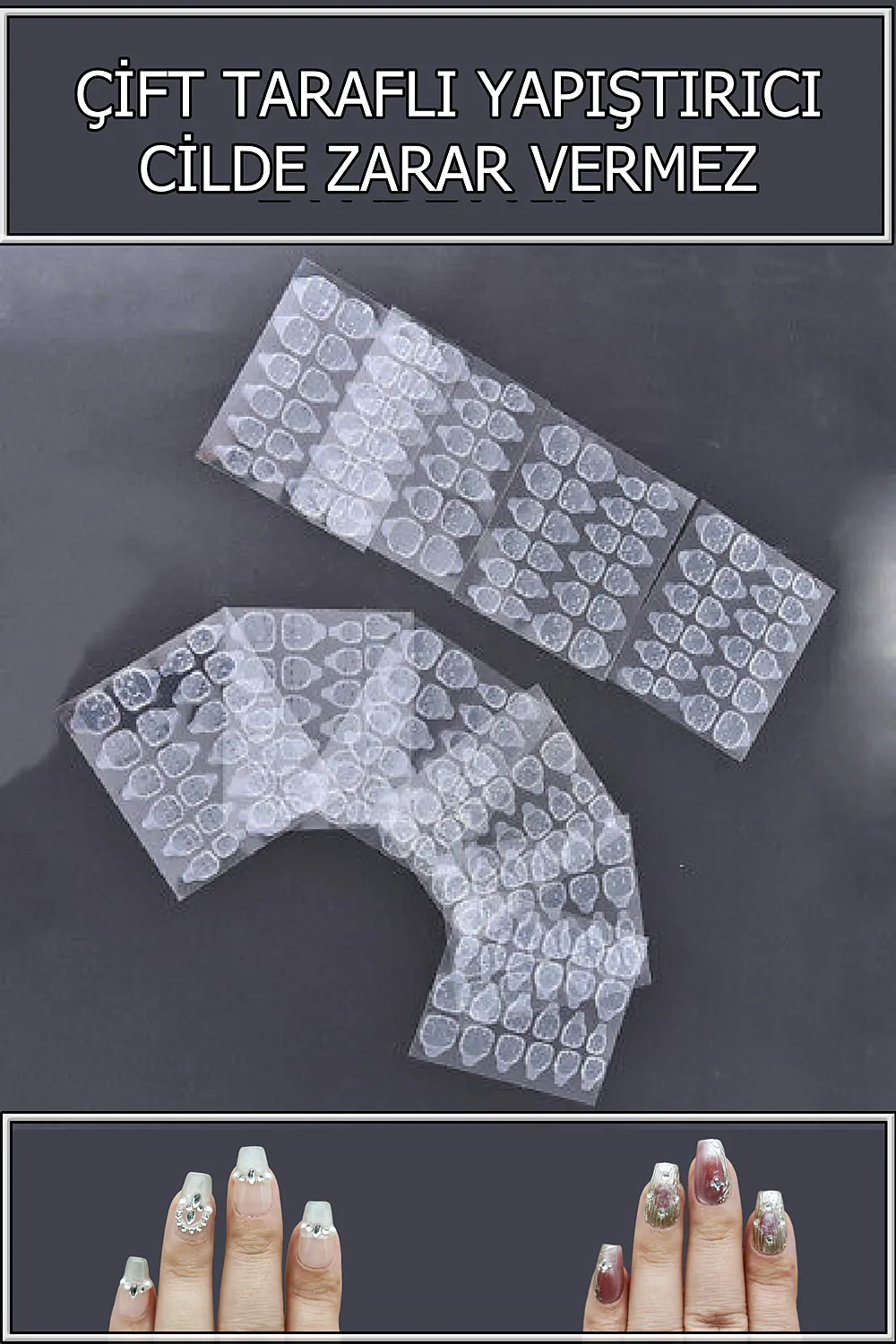 Kuvvetli çift taraflı takma tırnak yapıştırma bandı.; Çift taraflı takma tırnak yapıştırıcı ile tırnaklarınızı kolayca değiştirin ve güzellik rutininizi pratikleştirin ; ; Cilde zarar vermeyen jel formülü sayesinde, tırnaklarınızın doğal görünümünü bozmadan güvenli bir şekilde yapıştırma imkanı sunar ; ; Çift taraflı yapıştırıcı özelliği ile tırnaklarınızı istediğiniz yöne kolayca yapıştırabilir ve istediğiniz stili elde edebilirsiniz ; ; Profesyonelce takma tırnak yapıştırmanın sırları: ; Hangi yapıştırıcıyı kullanırsanız kullanın ilk olarak mutlaka ve mutlaka tırnak etlerinizi portakal çubuğu (manikür çubuğu) ile iterek düzeltin.; Bu işlemin amacı takma tırnağın tırnak etinizin üzerine gelmemesi ve takma tırnağın düzgün yerleştirilmesi için çok önemlidir.; ; ; Takiben kendi tırnak yüzeyinizi iyice törpüleyin.; ; Bu işlemin amacı yapıştırıcının tırnak yüzeyinize daha iyi tutunması içindir.; ; ; Son olarak tırnak yüzeyinizi alkollü mendil ile iyice temizlemeniz gerekiyor.; ; Bu işlemin amacı ise törpüleme sonrası kalan tozların ve tırnak üzerindeki yağın temizlenmesi içindir ki çok önemlidir.; ; ; Çift taraflı bant için kullanılan yaygın bir yöntem ise tırnak üzerine yapıştırdıktan sonra takma tırnağı takmadan önce saç kurutma makinası ile yapıştırcıyı yumuşatıp sonra takma tırnağı yapıştırmaktır ki gerçekten etkilidir.; ; ; Son olarak takma tırnağı yapıştırdıktan sonra 1-2 saat ellerinizi suyla temas ettirmemeniz gerekiyor ki yapıştırıcı tam olarak yapışsın.; ; ; Bu yapıştırıcı yukarıda bahsedilen işlemleri doğru uyguladıktan sonra uzun süre elinizde kalabilir.; ; ; Çift taraflı bant ve sıvı yapıştırıcının birlikte kullanıldığı alternatif bir yöntemdir ve yine çok etkilidir.; Sudan etkilenmez.;Yukarıdaki işlemleri uyguladıktan sonra takma tırnağı çift taraflı banta yapıştırmadan önce içerisine sıvı yapıştırıcı sürmektir.; Yani tırnağınızın üzerinde çift taraflı bant olacak, üzerine sıvı yapıştırıcı sürülecek ve takiben takma tırnak yapıştırılacak.; Böylece sıvı yapıştırıcı cildinize ve tırnağınıza temas etmeyecek.