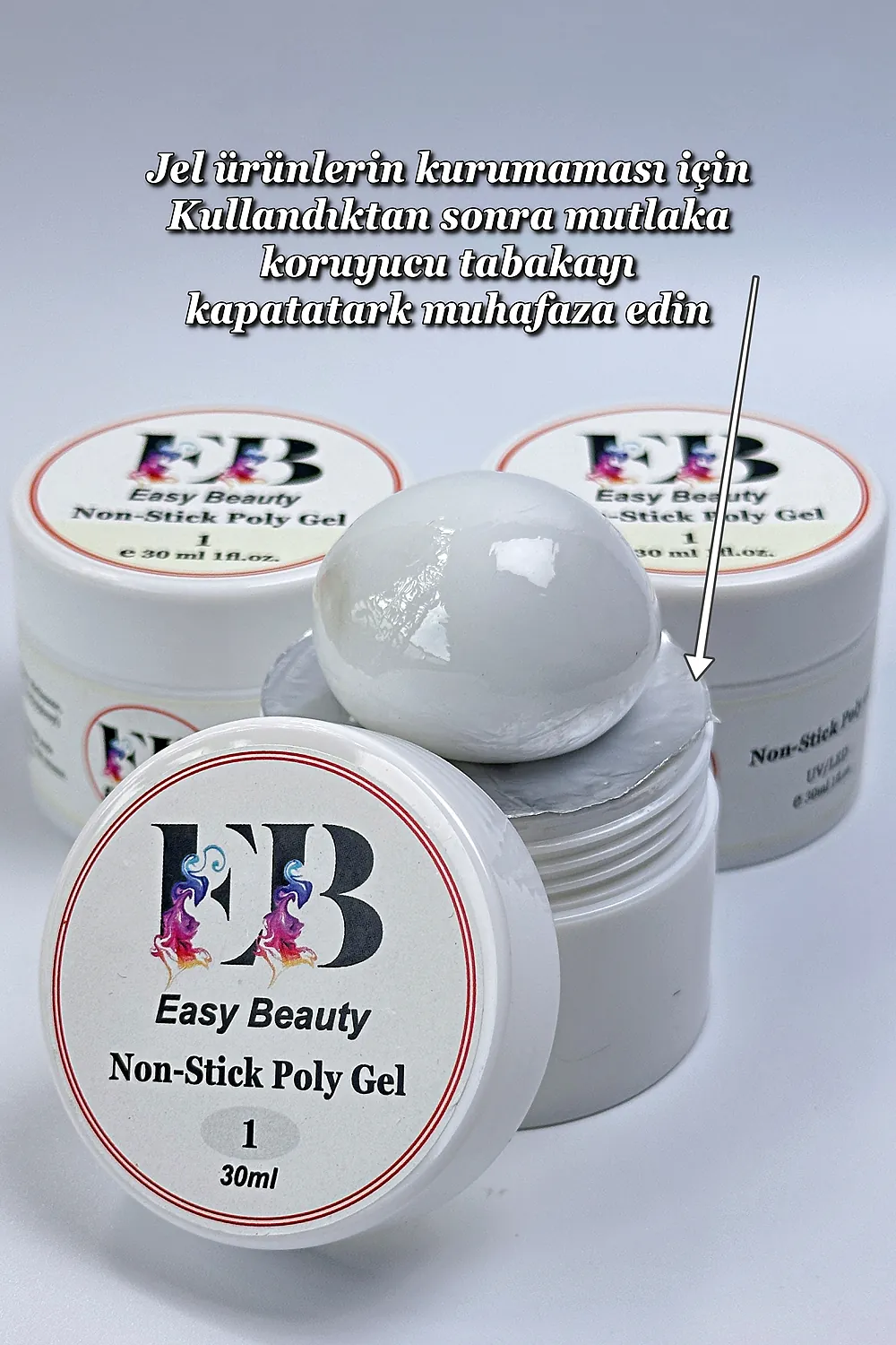 Sıradan poly jelleri unutun! İstediğiniz mükemmel manikür artık çok daha ekonomik ve çok daha uzun ömürlü: Ele Yapışmayan Hamur Jel Kıvamında Poli Jel ; Neden Diğerlerinden Farklı? ; ; Piyasadaki standart 15 ml ürünlerin iki katı hacim sunan 30 ml profesyonel poly jel’imiz, hem meraklılar hem de profesyonel manikürcüler için tasarlandı.; ; Ele yapışmayan hamur jelin kullanımı ve uygulaması çok kolaydır ; Sadece kalıp tırnak ve hamur jel protez tırnak yapımı için yeterlidir.; Fırça, alkol, Slip solüsyon, monomer gibi hiç bir ekstra aksesuara ihtiyacınız yoktur.; ; Nail art için kullanılabilir; Dev Ekonomi: 30 ml poly jel ile çok daha fazla sayıda manikür yapın,; ; Kullanım Kolaylığı: ; ; Özel formülü sayesinde ele yapışmayan kıvamıyla kolayca şekil verilebilir.; Nail art için kullanılabilir; ; UV/LED ışığında anında ve mükemmel şekilde kurur.; ; Çıkmaz, soyulmaz ve uzun süreli parlaklığını korur.; ; Doğal tırnakları güçlendirir ve mükemmel bir baz katman olarak işlev görür.; ; Çok Yönlü Kullanım: ; Jel renklerin altına baz olarak uygulanabilir veya üst katman olarak manikürünüzü mühürleyip koruyabilir.; ; Detaylı Kullanım Talimatları ; ; Poly jel kullanımı son derece basittir.; İşte adım adım mükemmel sonuç için kılavuzunuz: ; ; ; İhtiyacınız Olan Malzemeler: ; UV/LED Lamba ; Primer ; Tırnak toz fırçası ; 30 ml Poly Jel Ürününüz ; Base Coat ve Top Coat; ; ; Hazırlık Aşaması (Çok Önemli!): ; Öncelikle bütün jel kullanımlarında tırnak etlerinizi iterek düzeltin ve temizleyin.; Tırnak yüzeyini hafifçe törpüleyerek doğal tırnağın parlaklığını giderin (matlaştırın).; ; Bir kulak çubuğu veya fırça yardımıyla tırnak yüzeyini izopropil alkolle iyice silin.; Bu adım, yağ ve nemi uzaklaştırarak jelin tırnağa mükemmel yapışmasını sağlar.; ; İnce bir katman pH bağlayıcı (primer) uygulayın ve kurumaya bırakın.; (Bu adım, jelin ömrünü önemli ölçüde uzatır).; ; Uygulama Aşaması: ; Az Miktarda Ürün Kullanın! 30 ml ürününüz büyük olsa da her seferinde az miktarda almanız yeterlidir.; Fazla ürün taşmaya ve topaklanmaya neden olabilir.; ; Poly jeli ister kalıp tırnağın içine isterseniz kendi tırnağınıza sürün.; Bu işlem sizin alışkanlığınıza göre değişiklik gösterebilir.; ; Tırnağınızın ucunda kaln jel kalın olacaktır.; Bunu inceltmek için mağazamızda bulabileceğiniz silikon uçlu şekil verme fırçası ile bastırın ; Jeli ince ve eşit bir katman halinde yaymak çok önemlidir.; Kalın katmanlar tam kurumayabilir.; ; Hemen UV/LED lambanızın altında 60 saniye) kurutun.; ; Son Aşama: ; En son yine üst katman (top coat) olarak kullanıp aynı işlemleri tekrarlayabilirsiniz.; ;