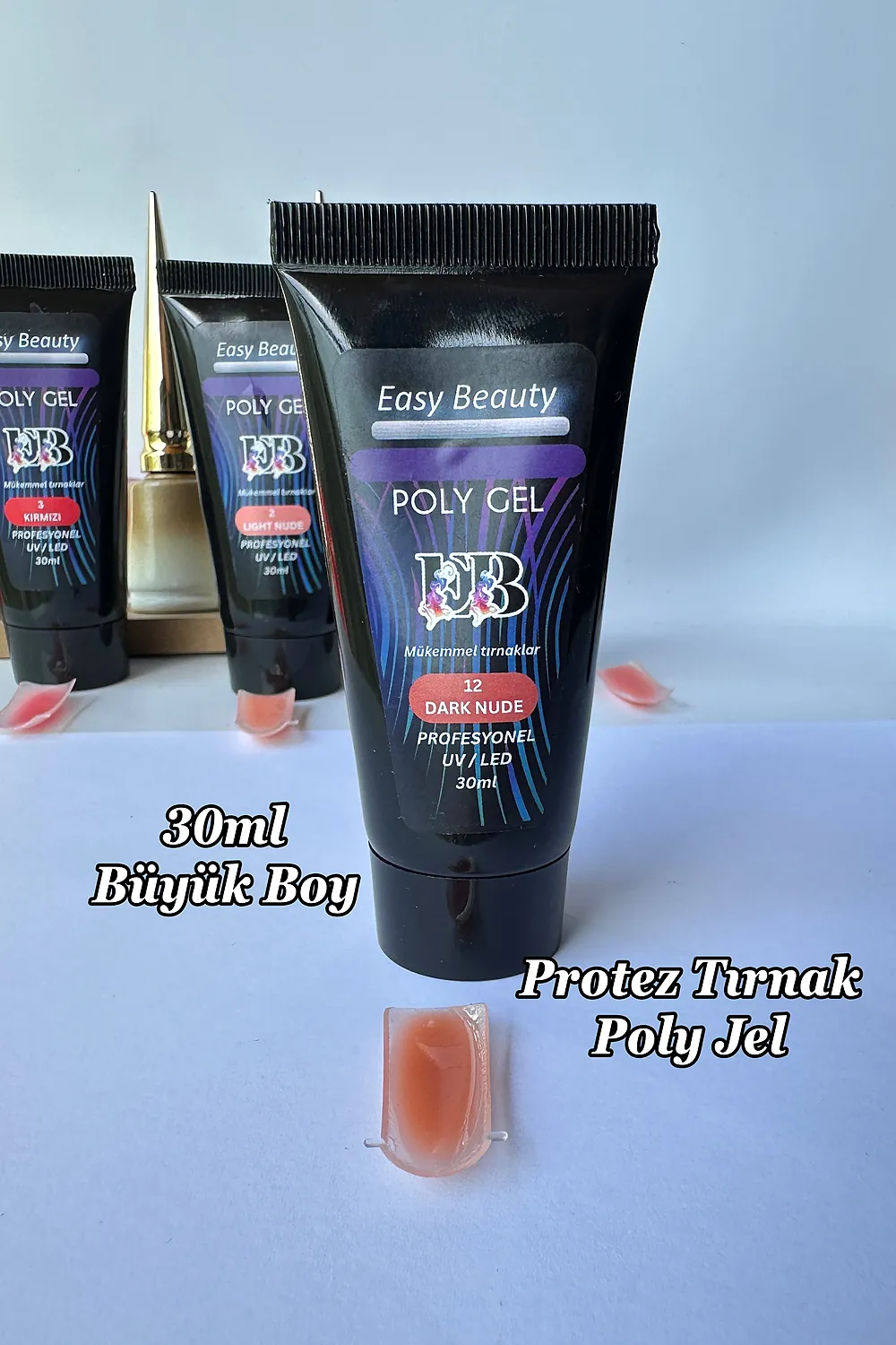 Sıradan poly jelleri unutun! İstediğiniz mükemmel manikür artık çok daha ekonomik ve çok daha uzun ömürlü.; ; Neden Diğerlerinden Farklı? ; Piyasadaki standart 15 ml ürünlerin iki katı hacim sunan 30 ml profesyonel poly jel’imiz, hem meraklılar hem de profesyonel manikürcüler için tasarlandı.; Aynı fiyata neredeyse iki ürün almış gibi olacaksınız! ; Kusursuzluğun Yeni Tanımı: ; Dev Ekonomi: 30 ml şeffaf poly jel ile çok daha fazla sayıda manikür yapın, müşteri başına maliyeti düşürün ve stok sıkıntısına veda edin.; ; Kullanım Kolaylığı: Özel formülü sayesinde akışkan kıvamıyla fırçadan mükemmel bir şekilde ayrılır.; Baloncuk yapmaz, kolayca sürülür ve dağıtılır.; İster ince katmanlar ister dolgun kaplamalar için ideal sunar.; ; Üstün : UV/LED ışığında anında ve mükemmel şekilde kurur.; Çıkmaz, soyulmaz ve uzun süreli parlaklığını korur.; Doğal tırnakları güçlendirir ve mükemmel bir baz katman olarak işlev görür.; ; Çok Yönlü Kullanım: Şeffaf yapısıyla, tek başına doğal ve parlak bir bitiş için kullanılabilir, jel renklerin altına baz olarak uygulanabilir veya üst katman olarak manikürünüzü mühürleyip koruyabilir.; ; Detaylı Kullanım Talimatları ; Poly jel kullanımı son derece basittir.; İşte adım adım mükemmel sonuç için kılavuzunuz: ; İhtiyacınız Olan Malzemeler: ; UV/LED Lamba ; %70+ izopropil alkol (dehydrator yerine) ve gerekirse jeli dağıtmak ve kolay sürülebilir hale getirmek için ; pH bağlayıcı/primer ; Tırnak toz fırçası ; 30 ml Poly Jel Ürününüz ; Yapışmayan manikür fırçası (opsiyonel, dağıtmak için) ; Hazırlık Aşaması (Çok Önemli!): ; Tırnak yüzeyini hafifçe törpüleyerek doğal tırnağın parlaklığını giderin (matlaştırın).; ; Bir kulak çubuğu veya fırça yardımıyla tırnak yüzeyini izopropil alkolle iyice silin.; Bu adım, yağ ve nemi uzaklaştırarak jelin tırnağa mükemmel yapışmasını sağlar.; ; İnce bir katman pH bağlayıcı (primer) uygulayın ve kurumaya bırakın.; (Bu adım, jelin ömrünü önemli ölçüde uzatır).; ; Uygulama Aşaması: ; Az Miktarda Ürün Kullanın! 30 ml ürününüz büyük olsa da her seferinde az miktarda (bir pirinç tanesi büyüklüğünde) almanız yeterlidir.; Fazla ürün taşmaya ve topaklanmaya neden olabilir.; ; Poly jeli ister kalıp tırnağın içine isterseniz kendi tırnağınıza sürün.; Bu işlem sizin alışkanlığınıza göre değişiklik gösterebilir.; ; Tırnağınızın ucunda kaln jel kalın olacaktır.; Bunu inceltmek için fırça ve alkol kullanabilirisniz.; ; Jeli ince ve eşit bir katman halinde yaymak çok önemlidir.; Kalın katmanlar tam kurumayabilir.; ; Hemen UV/LED lambanızın altında ürününüzün üzerinde yazan süre kadar (genellikle 60 saniye) kurutun.; ; İki katman uygulamanız önerilir.; İkinci katmanı da aynı şekilde uygulayıp kurutun.; ; Son Aşama: ; İsterseniz renkli jel veya desenler uygulayabilir, en son yine üst katman (top coat) olarak kullanıp aynı işlemleri tekrarlayabilirsiniz.