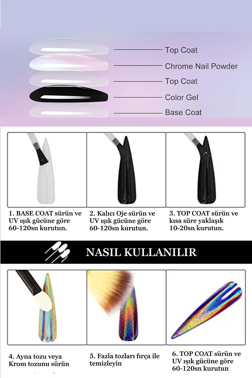 Tırnak süslemede kullanılan ve yüzlerce farklı dizayn yaratmanıza olanak sağlayan katı formdaki krom tozuna hayran kalacaksınız.; ; [Uygulaması Çok Kolay]: Kullanımı çok kolay ancak sonuçları harika bir ürünle tanışmaya hazır mısınız.; Sadece bir kaç dakika içerisinde yaratabileceğiniz tırnak tasarımları ile herkesi kendinize hayran bırakacasınız.; Ayna tozunu kullanarak ışıl ışıl tırnaklar yaratmanız çok kolay.; Salona gitmenize gerek kalmadan evde çok kolay nail art yapmaya hazır mısınız? ; ; [Nasıl Kullanılır]: ; Öncelikle tırnağınıza Base Coat uygulayın ve kurutun.; ; İkinci olarak koyu renk kalıcı oje sürün ve kurutun.; ; Takiben TOP COAT sürün ve çok kısa süre kurutun (maksimum 30 saniye).; ; Top coat ’ un hafif yapış yapış kalması gerek ki ayna tozunu kolaylıkla sürün ve tırnağa yapışmasını sağlayın.; ; Eğer tamamen kurutursanız krom tozu tırnağa yapışmayacak ve ayna gibi parlamayacaktır.; ; Eğer Top Coat’u az kurutursanız bu sefer de yapış yapış olduğu için krom tozu düzgün sürülemeyecektir.; ; Top Coat ’ tan sonra ayna tozunu silikon fırça ile tırnağınıza uygulayın.; ; Silikon fırçanın özelliği işiniz bittikten sonra kolayca temizlenebilmesidir.; ; Ayrıca esnek başlığı sayesinde tırnak kıvrımlarına tam uyum sağlar ve krom tozunun her yere eşit oranda sürülmesini kolaylaştırır.; ; Silikon fırçanız yok ise ürünle birlikte gelen far fırçalarını kullanabilirsiniz.; ; Eğer far fırçası ile istediğiniz sonucu alamazsanız parmağınızı kullanarak daha güzel sonuş elde edebilirsiniz.; ; Son olarak ince bir Top Coat daha sürün ve kurutun.; ; ; [Çok Amaçlı Silikon Fırça]: ; Krom tozu ile birlikte alacağınız silikon fırça ile tırnak süslemesi yapabilir, farınızı sürebilir, rujunuzu doğal görünecek şekilde sürebilir ya da cilt bakım ürünlerinizi yüzünüze ya da ellerinize kolaylıkla uygulayabilirsiniz.; ; Her kullanımdan sonra yıkayabilir ya da silerek bir sonraki kullanmanıza hazır hale getirebilirsiniz.
