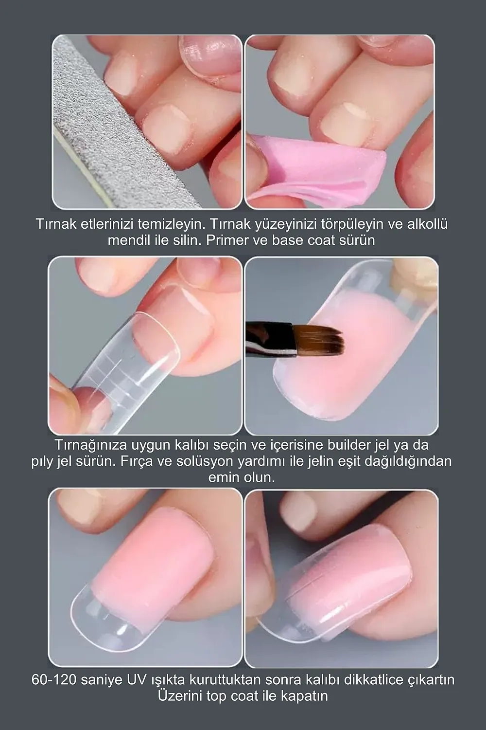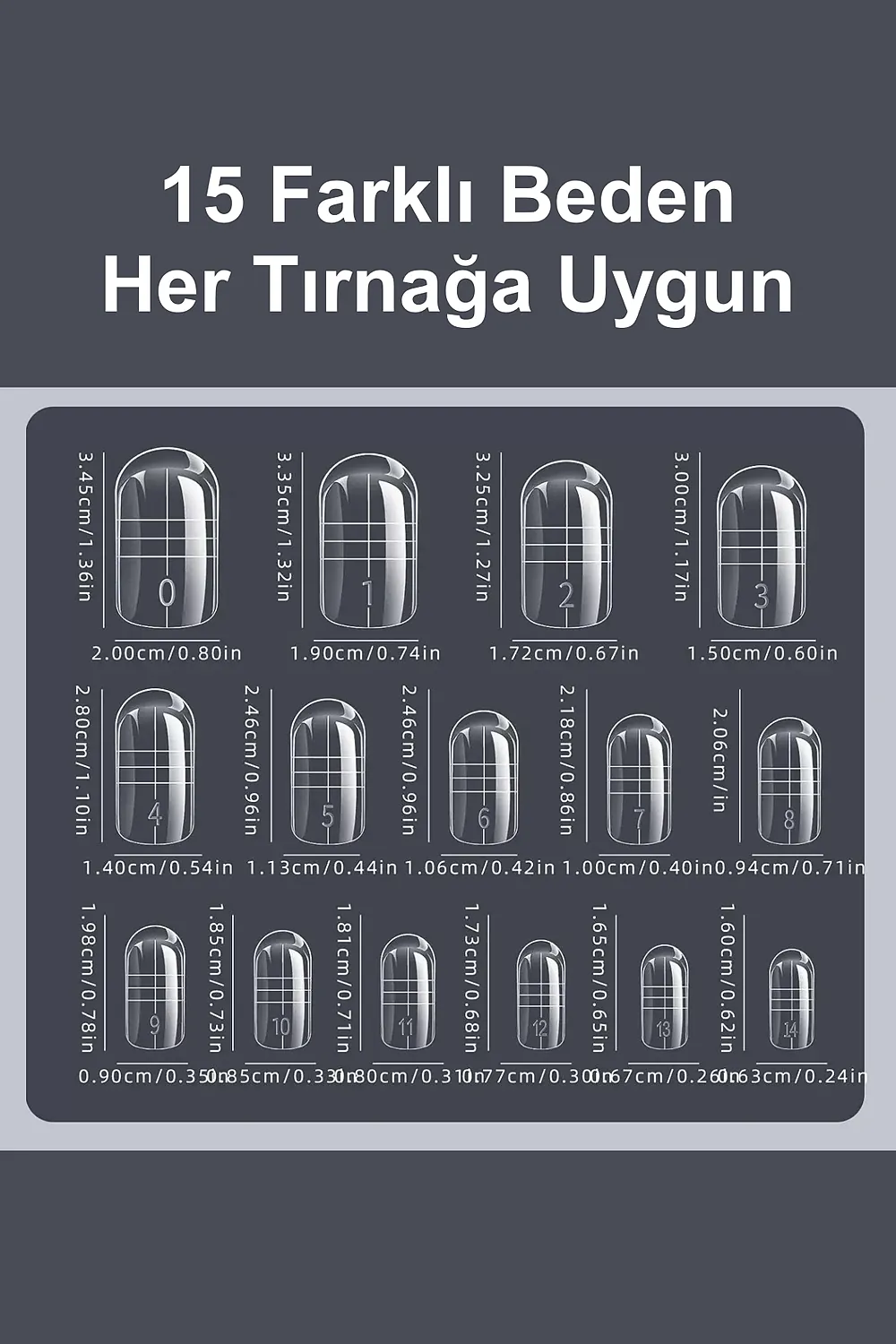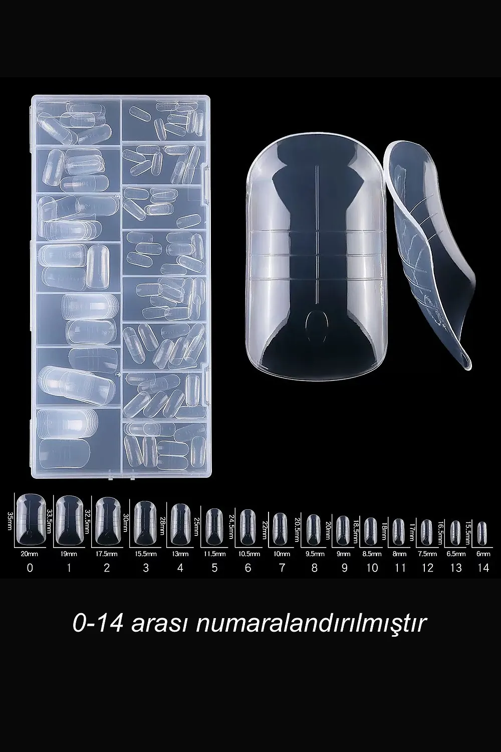 Ayak tırnaklarınız da mükemmel görünecek.; Yeni model ayak tırnağı üst from kalıp ile ayak tırnaklarınız için de protez tırnak yapmak çok kolay ; Ayak tırnkları için protez tırnak yapımında kullanılan 150 adet kalıp tırnak ; Her biri farklı boyutlarda olan 15 çeşit poly jel tırnak tipine sahip olun.; ; Her bir pakette toplamda 150 adet bulunan bu sette, farklı şekil seçenekleri sunan jel kalıp tipslerini keşfedin; ; Kütten bademe kadar geniş bir şekil yelpazesi sunarak kişisel zevkinize uygun tasarımlar oluşturabilirsiniz.; ; Poly jel kullanımıyla kolayca uygulanabilen bu tırnak tiplerini hızlı ve pratik şekilde hazırlayabilirsiniz.; ; Yüksek kalite standartlarına uygun olarak üretilmiştir.; ;
