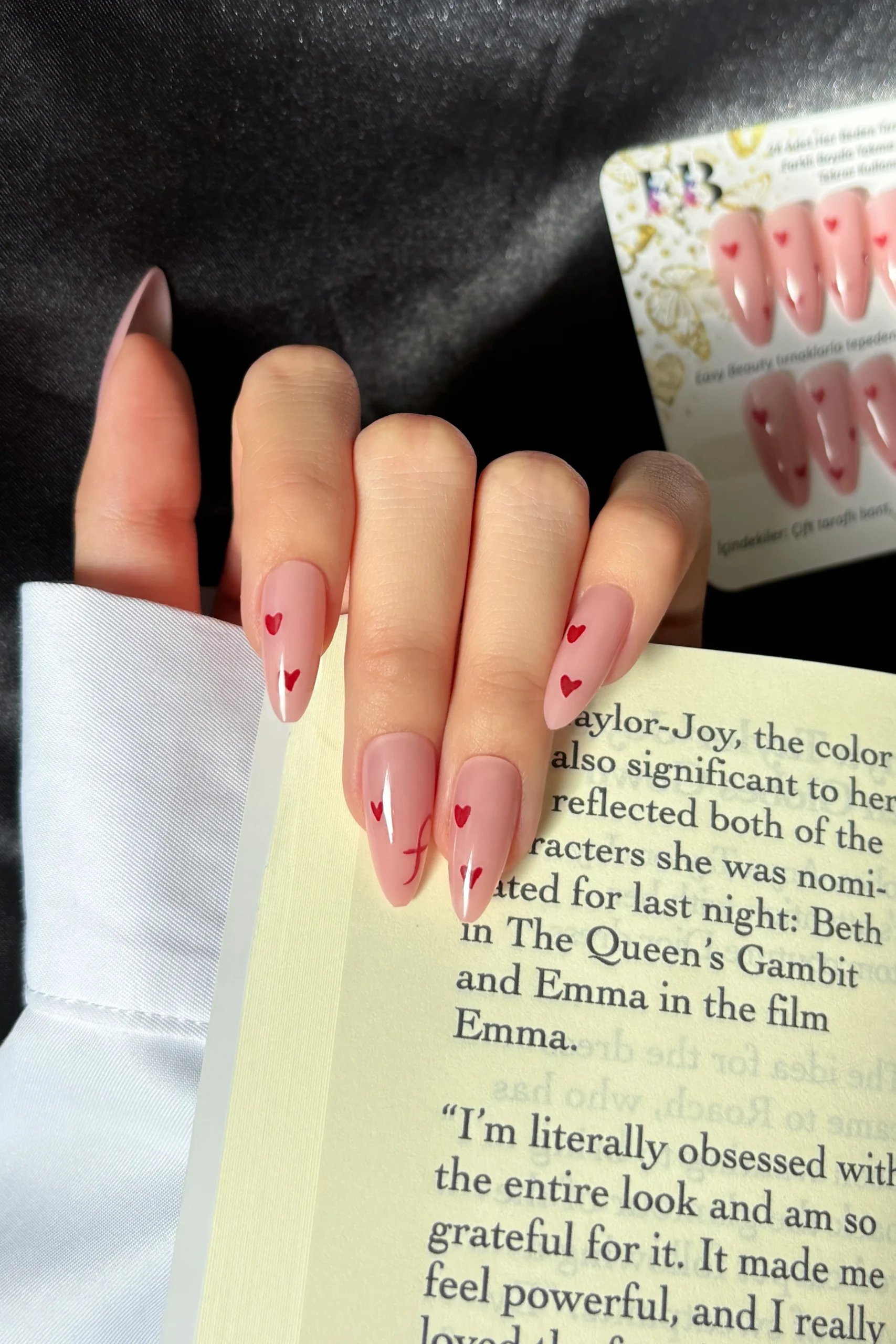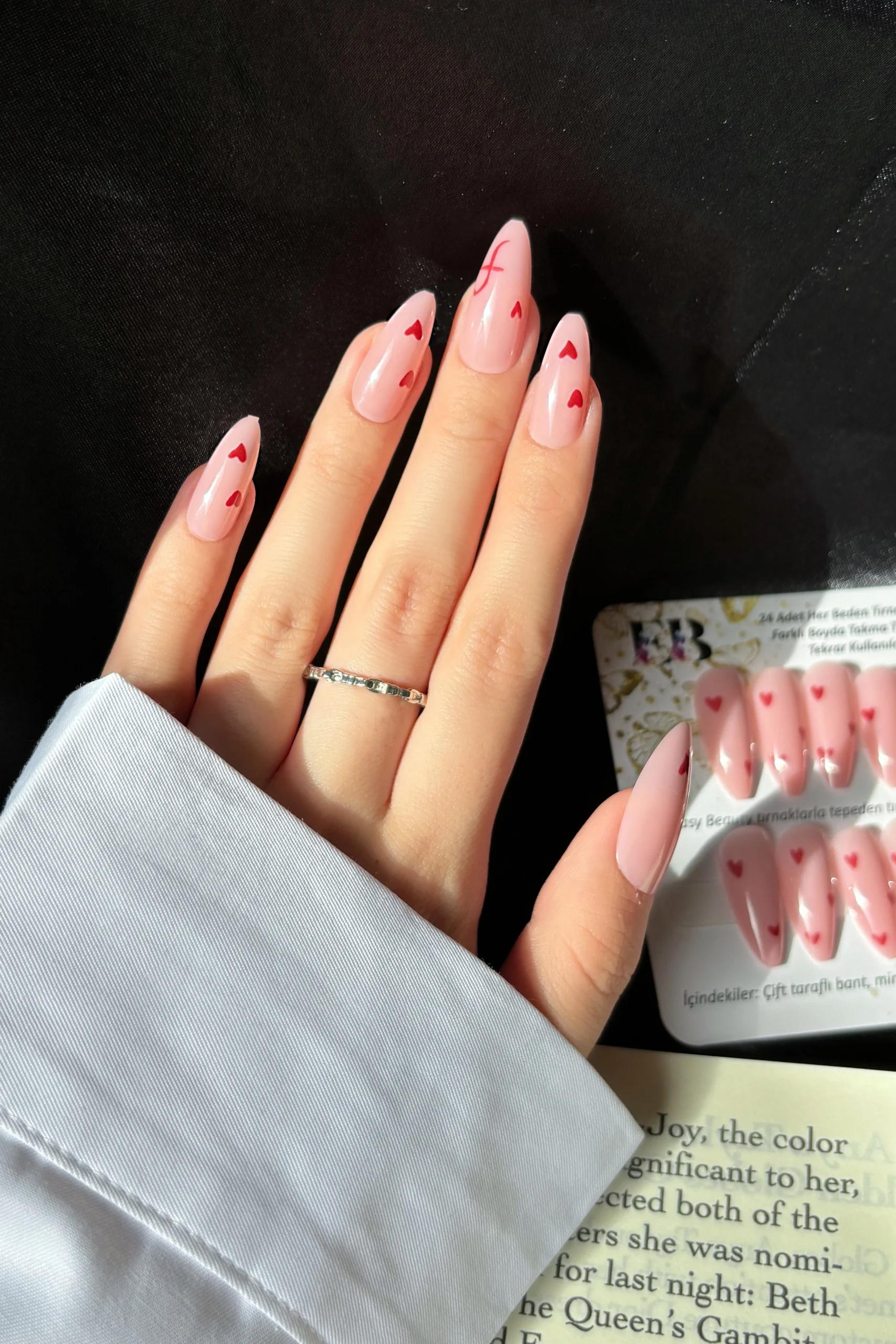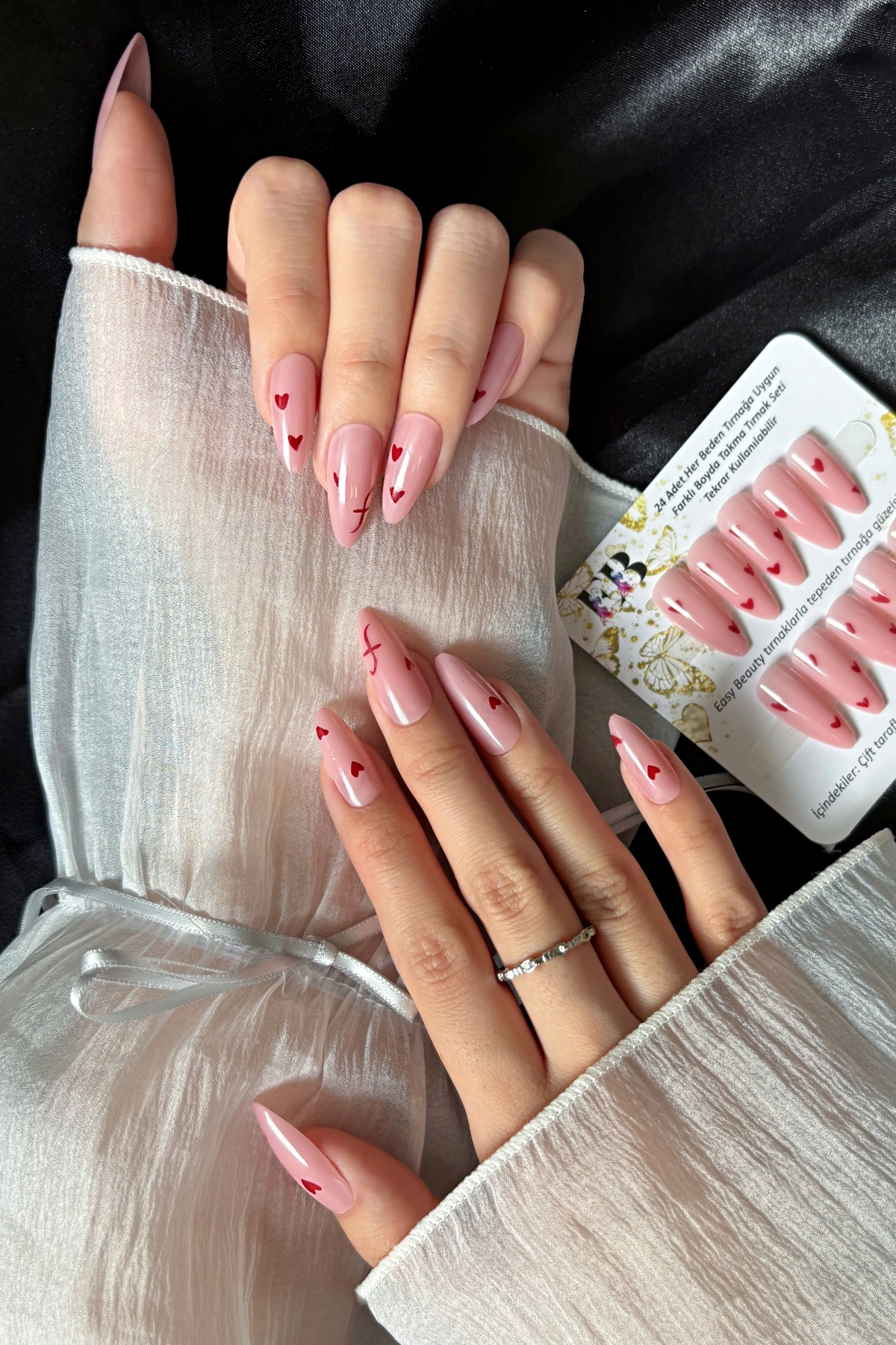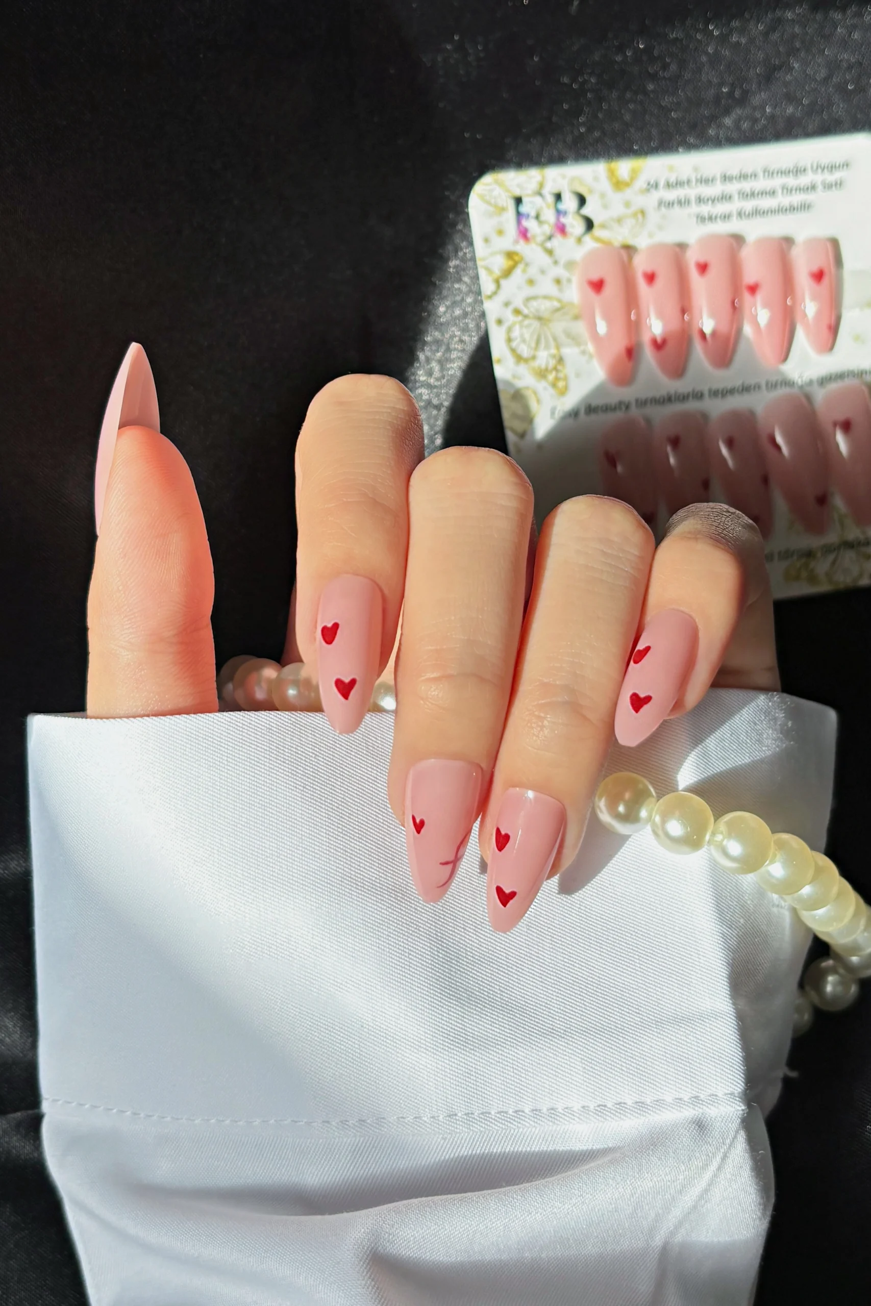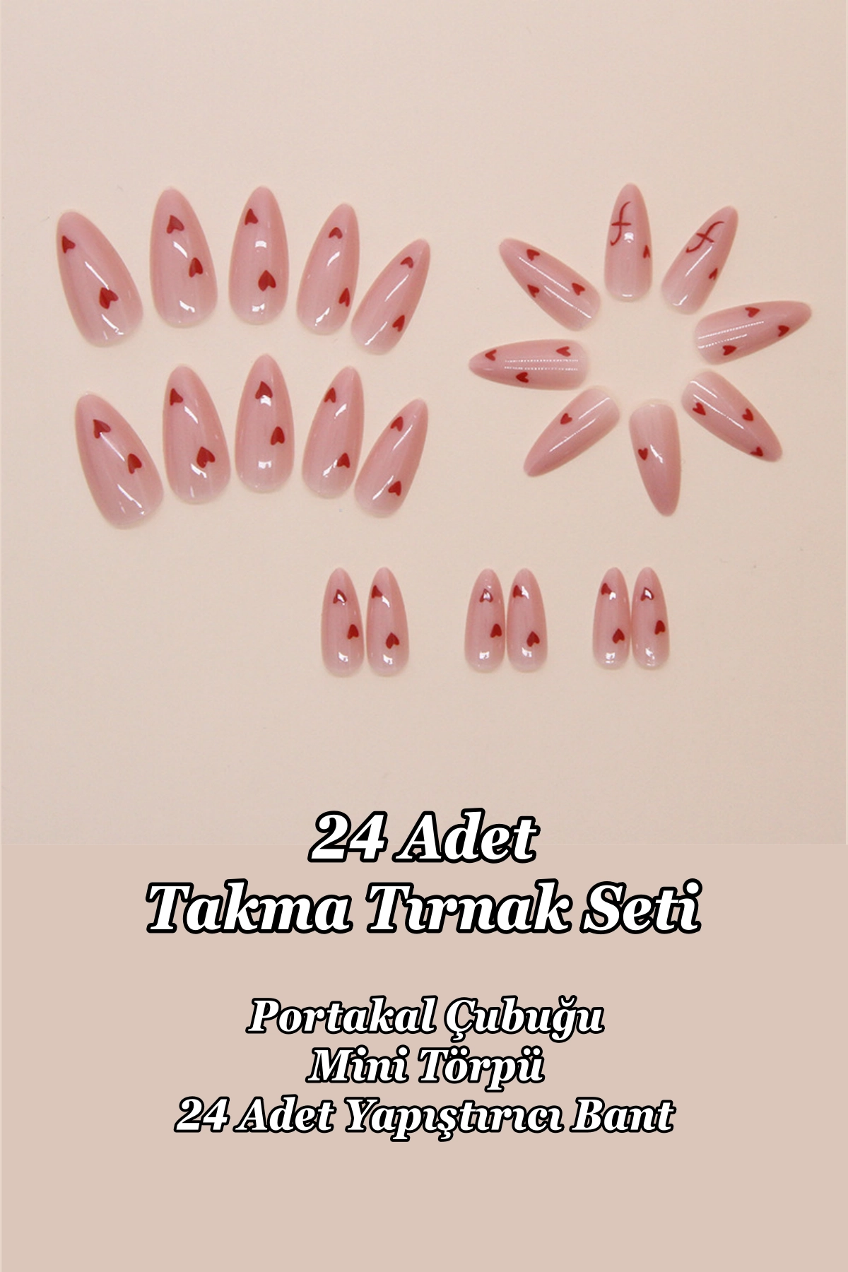 Badem Tırnak Kalp Desenli Orta Uzunlukta 24 Adet Takma Tırnak Seti W1839