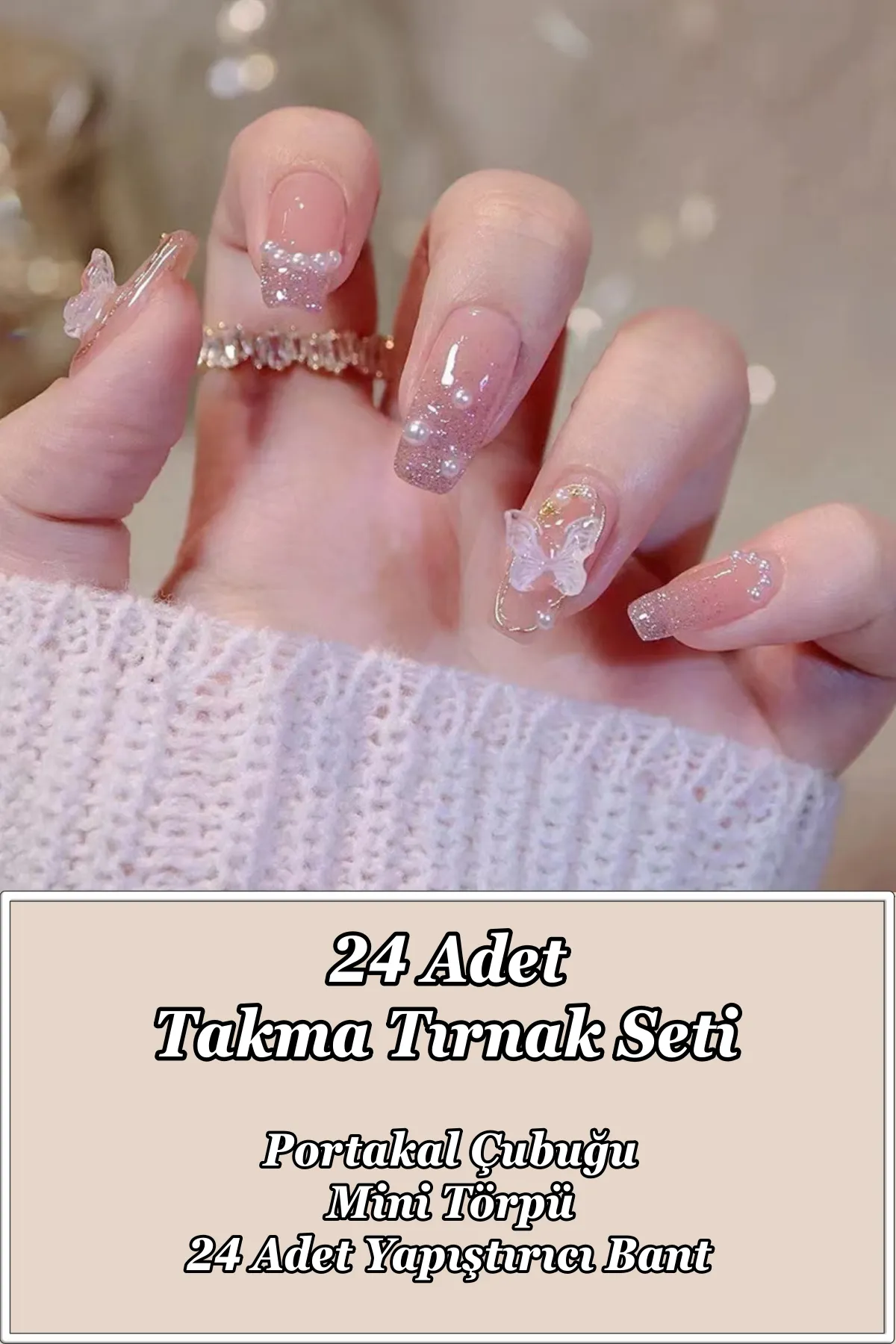 Kutu içerisinde 24 adet takma tırnak, 24 adet çift taraflı yapıştırıcı, manikür çubuğu (portakal çubuğu ve mini törpü bulunmaktadır.