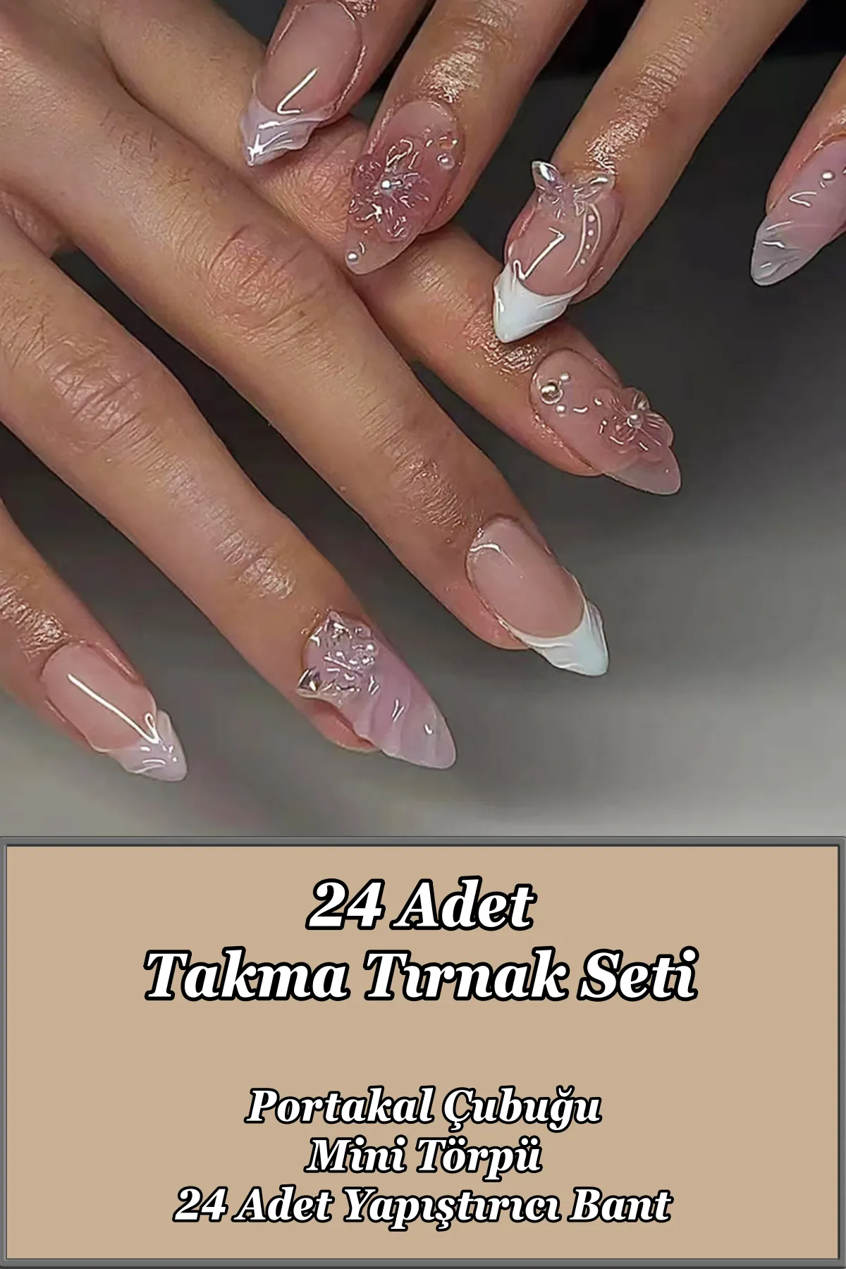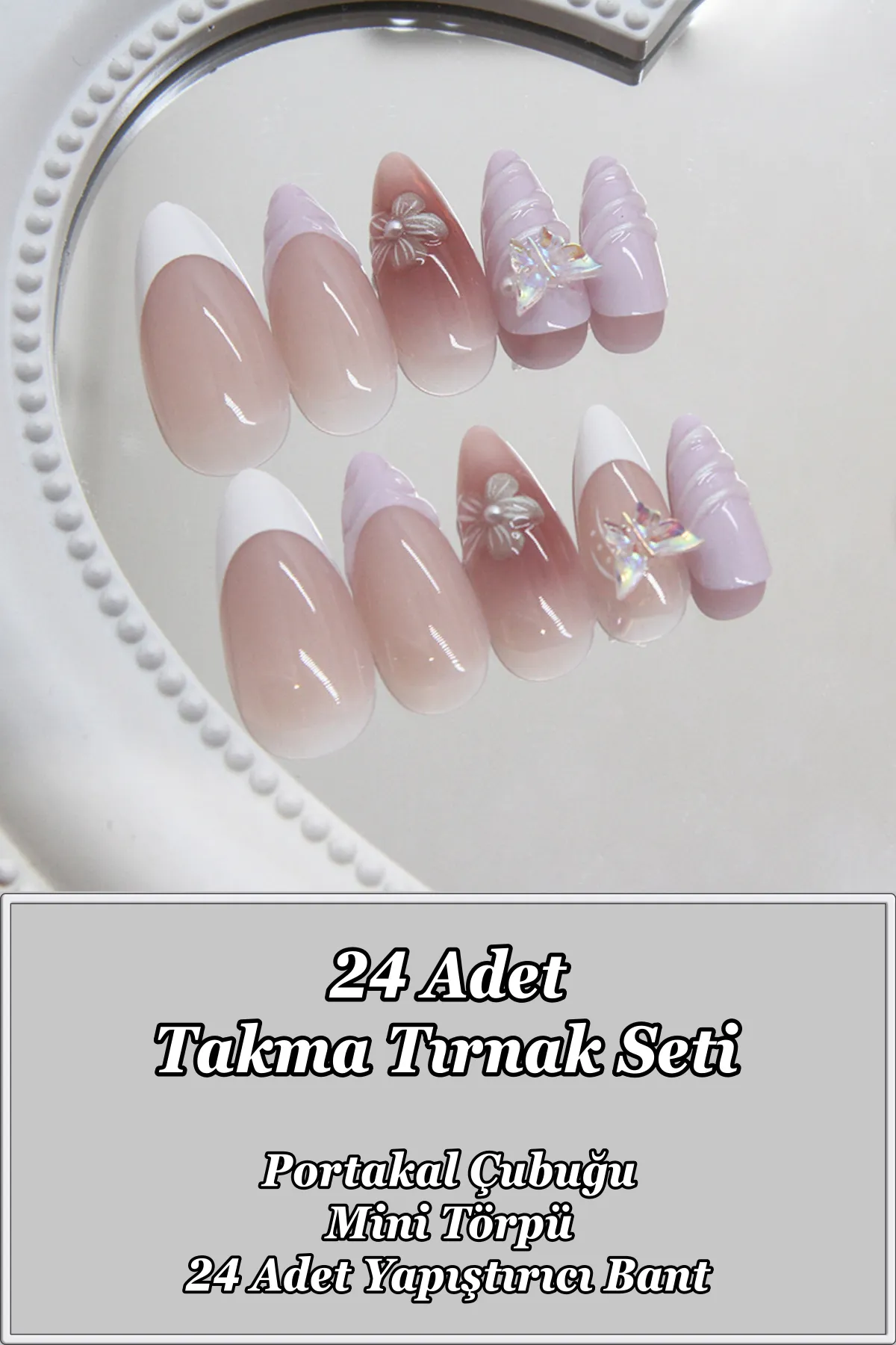 Kutu içerisinde 24 adet takma tırnak, 24 adet çift taraflı yapıştırıcı, manikür çubuğu (portakal çubuğu ve mini törpü bulunmaktadır.