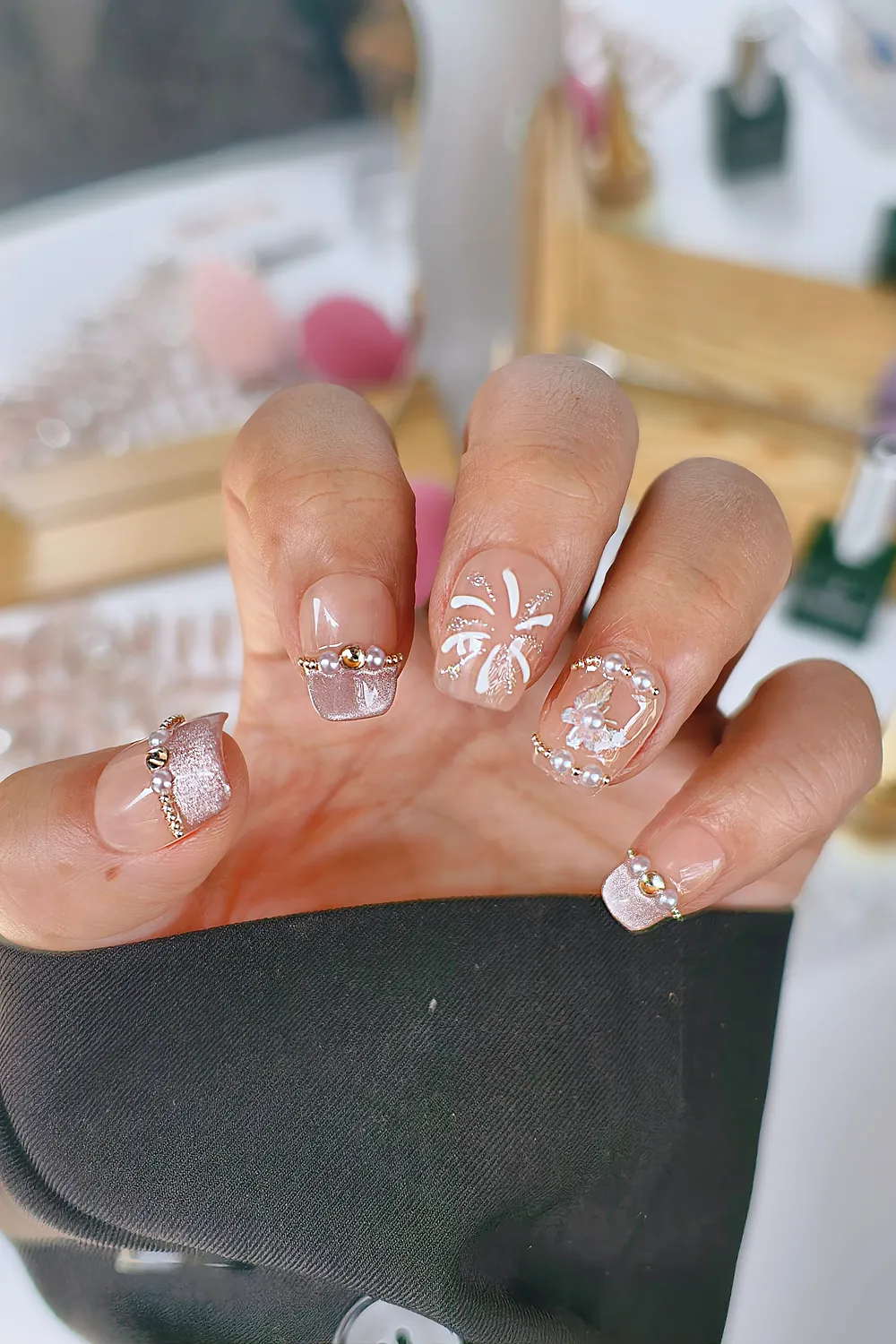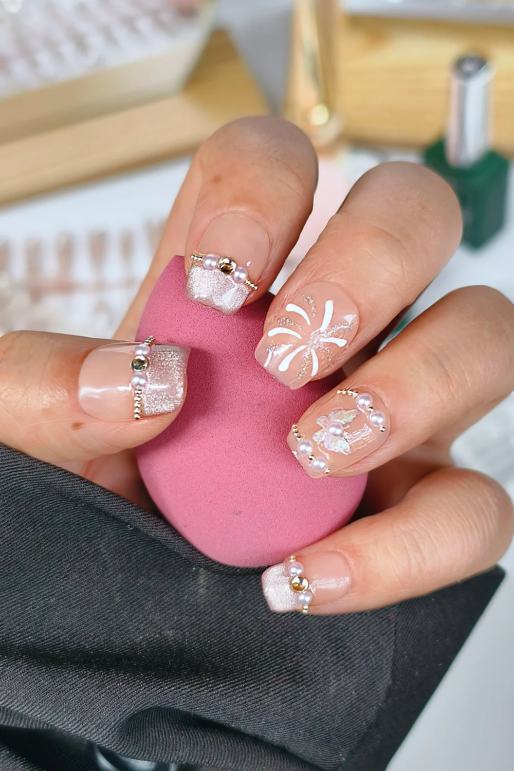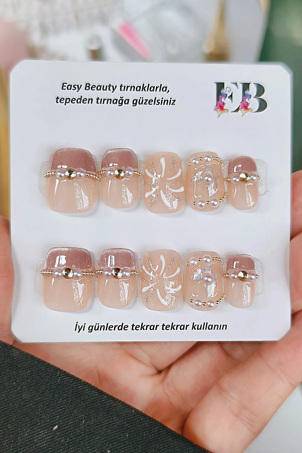Kedi Gözü French Protez Tırnak 10 Adet El Yapımı Takma Tırnak Seti 3701