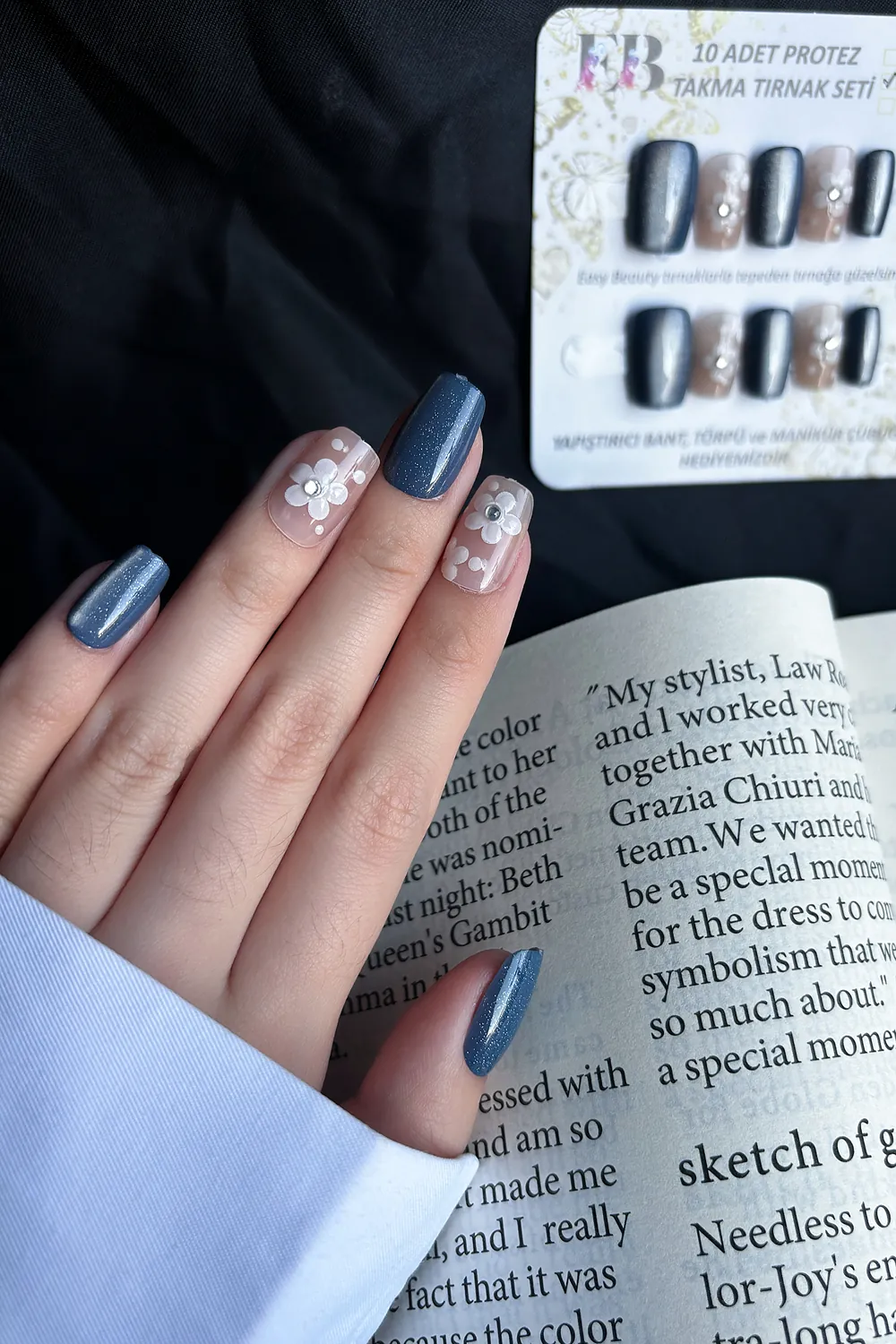 Protez Tırnak Çiçek Desenli 10 Adet El Yapımı Takma Tırnak Seti 3404