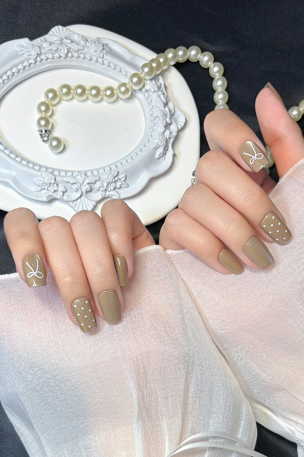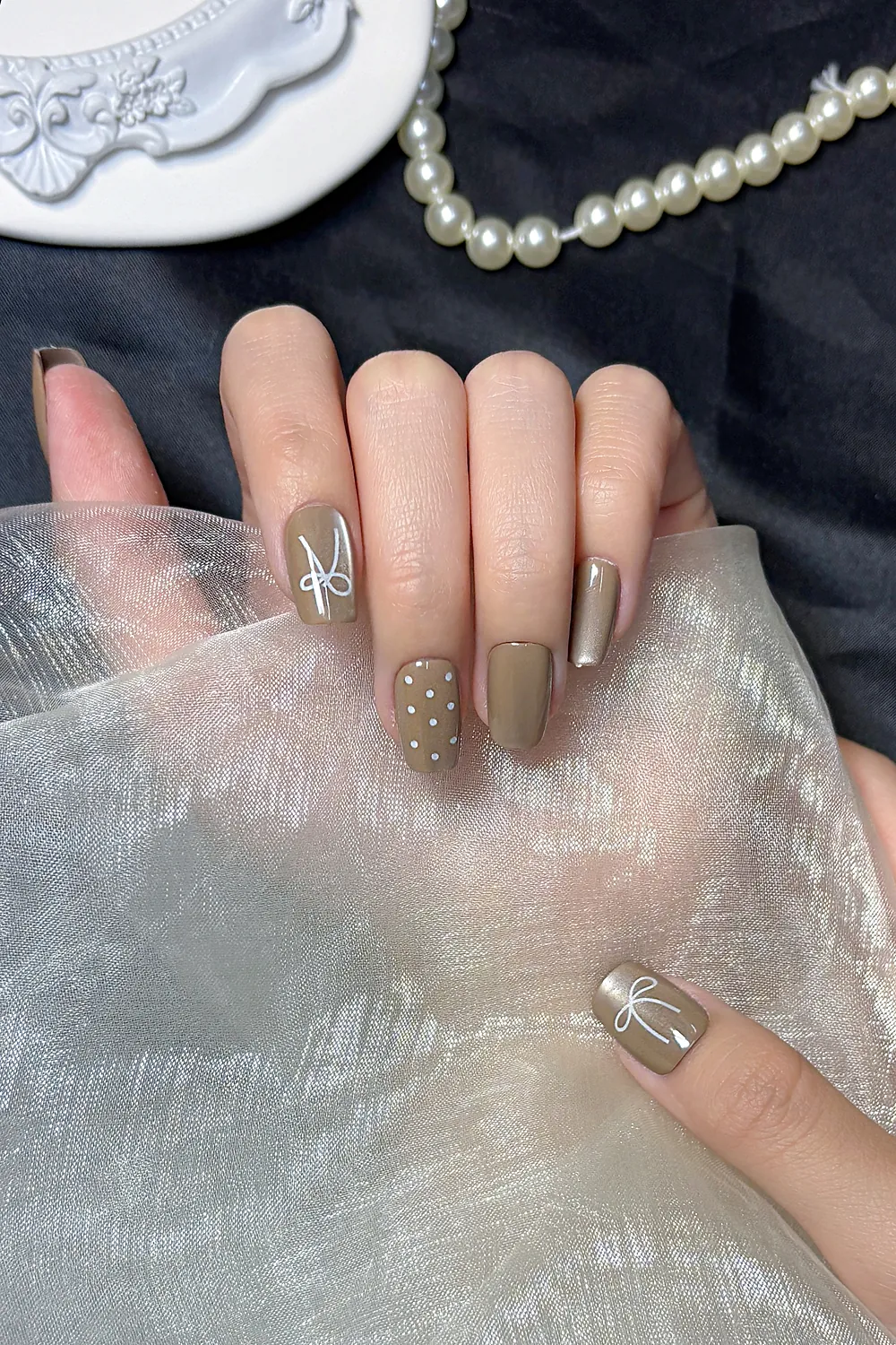 İnci Taneli Kedi Gözü French Protez Tırnak 10 Adet El Yapımı Takma Tırnak 3413
