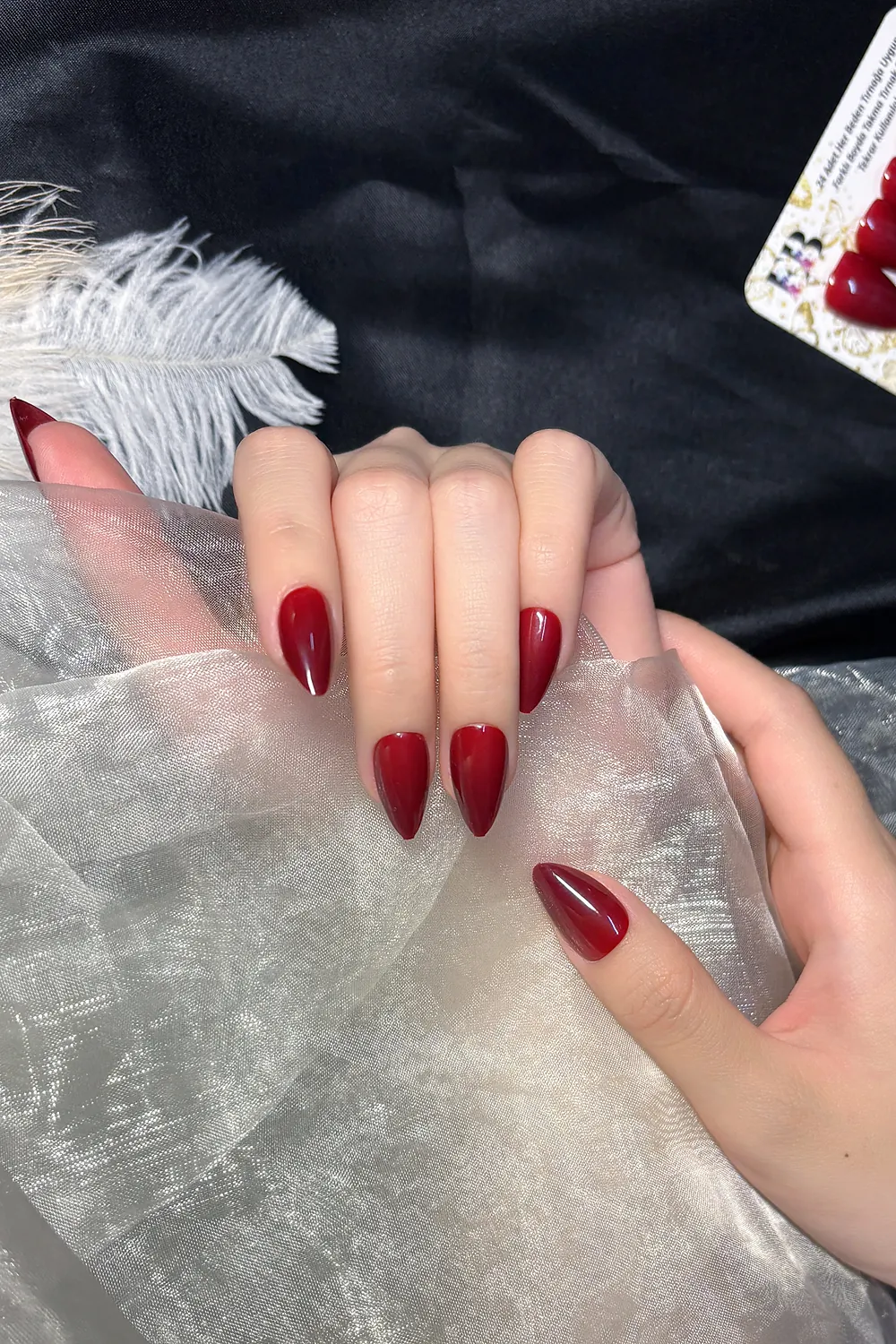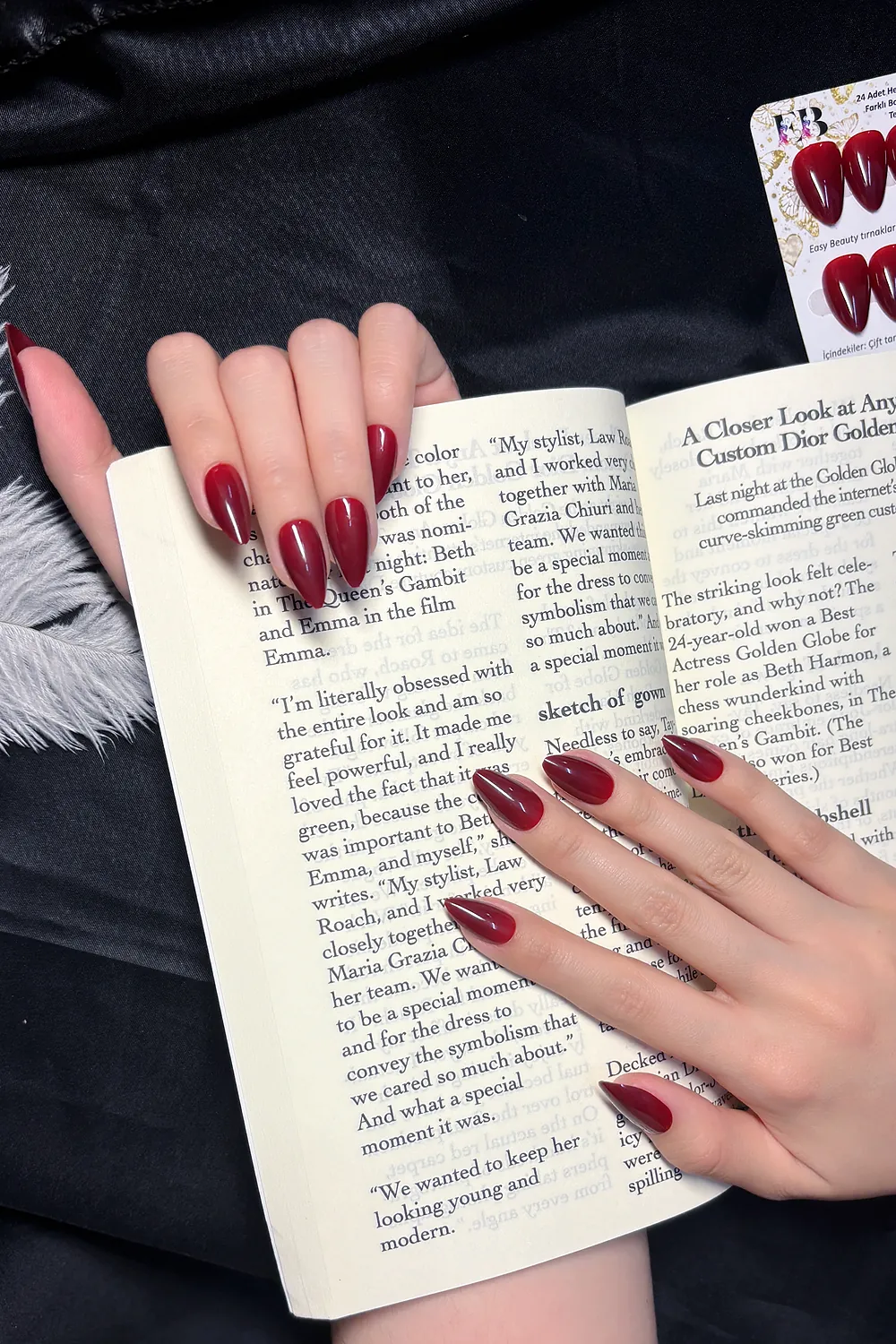 Kısa Badem 24 Adet Bordo Takma Tırnak Seti W1482
