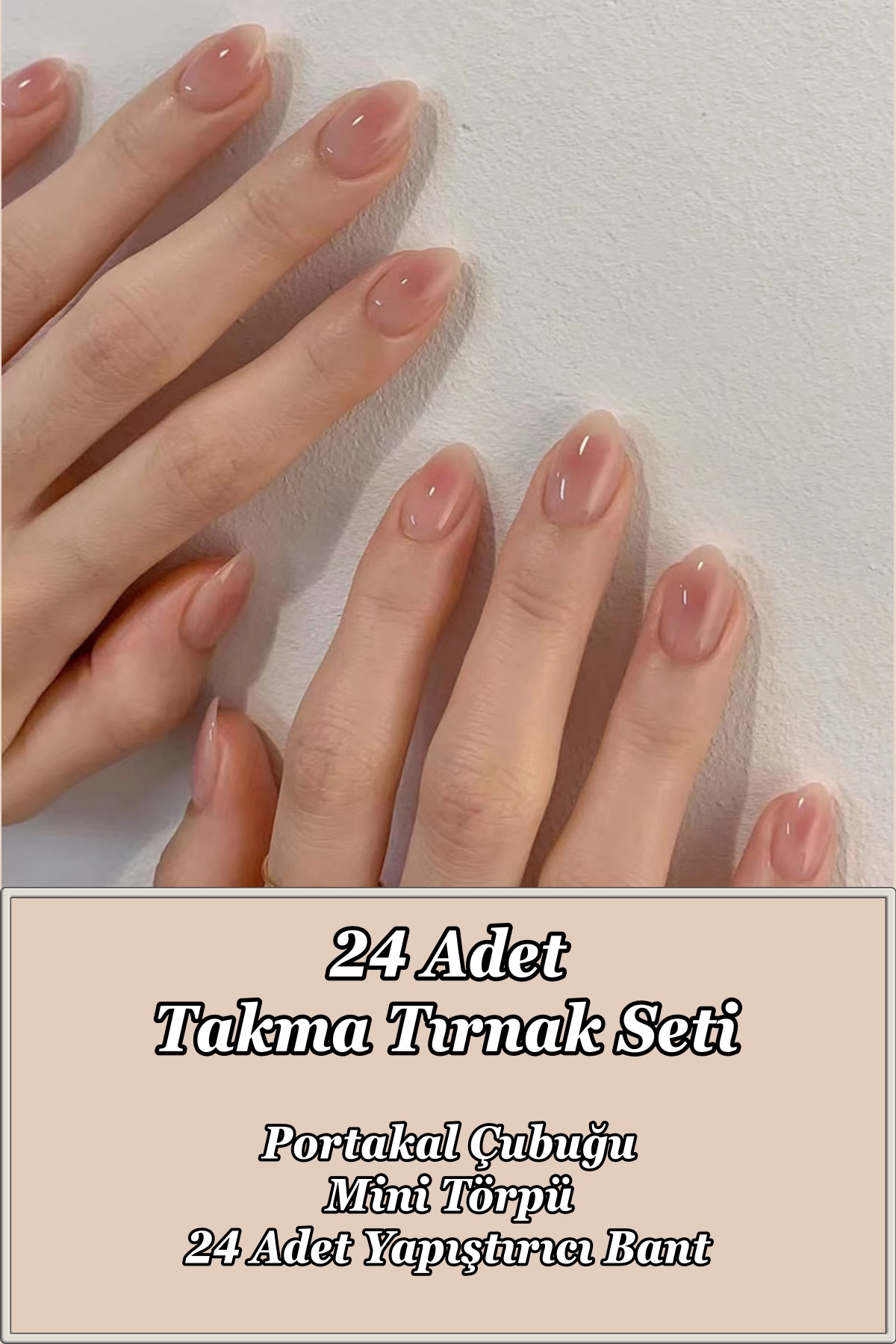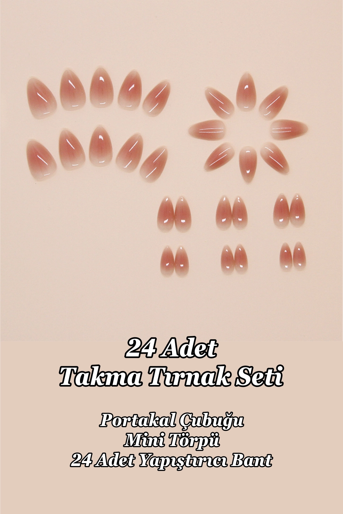 Kutu içerisinde 24 adet takma tırnak, 24 adet çift taraflı yapıştırıcı, manikür çubuğu (portakal çubuğu ve mini törpü bulunmaktadır.
