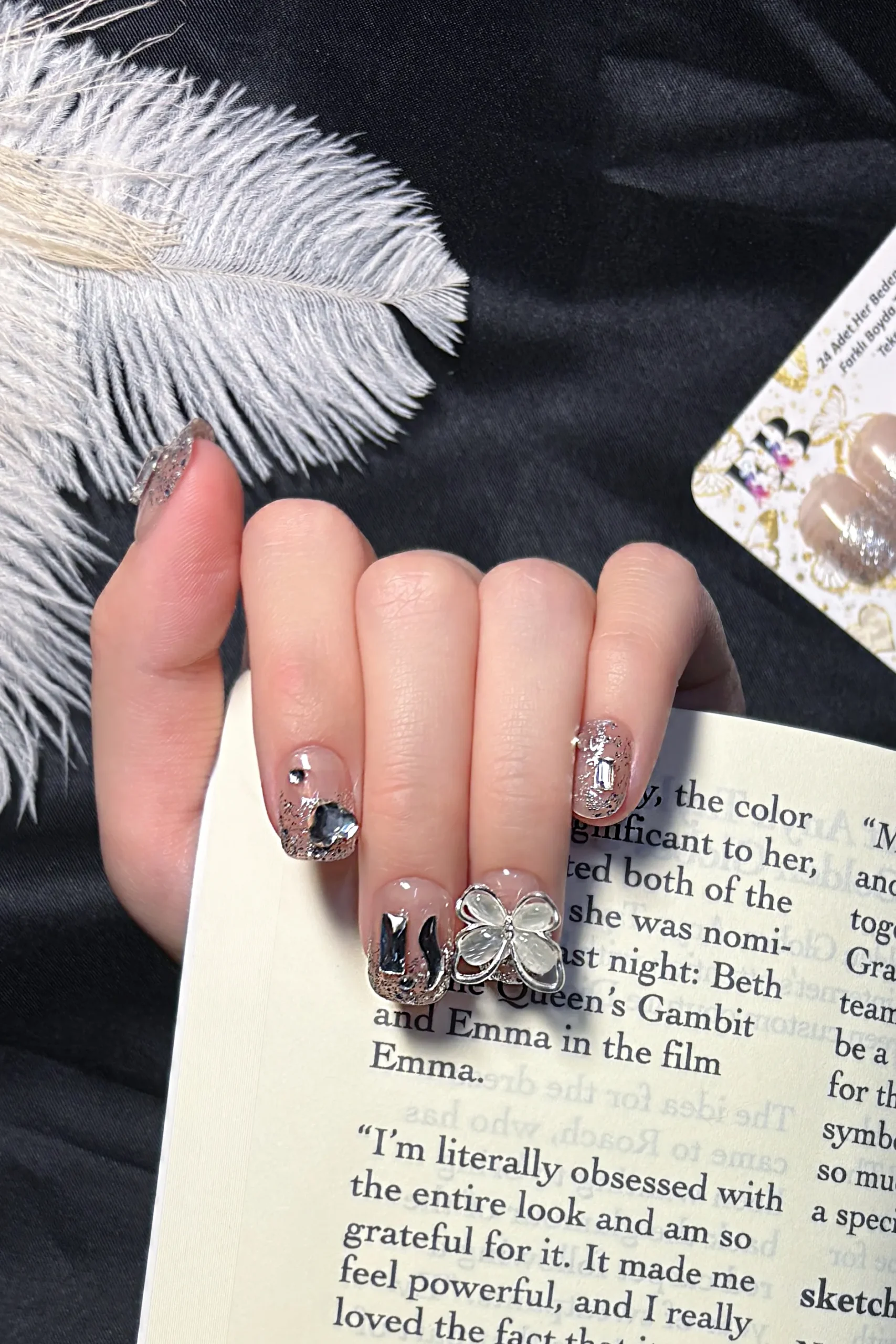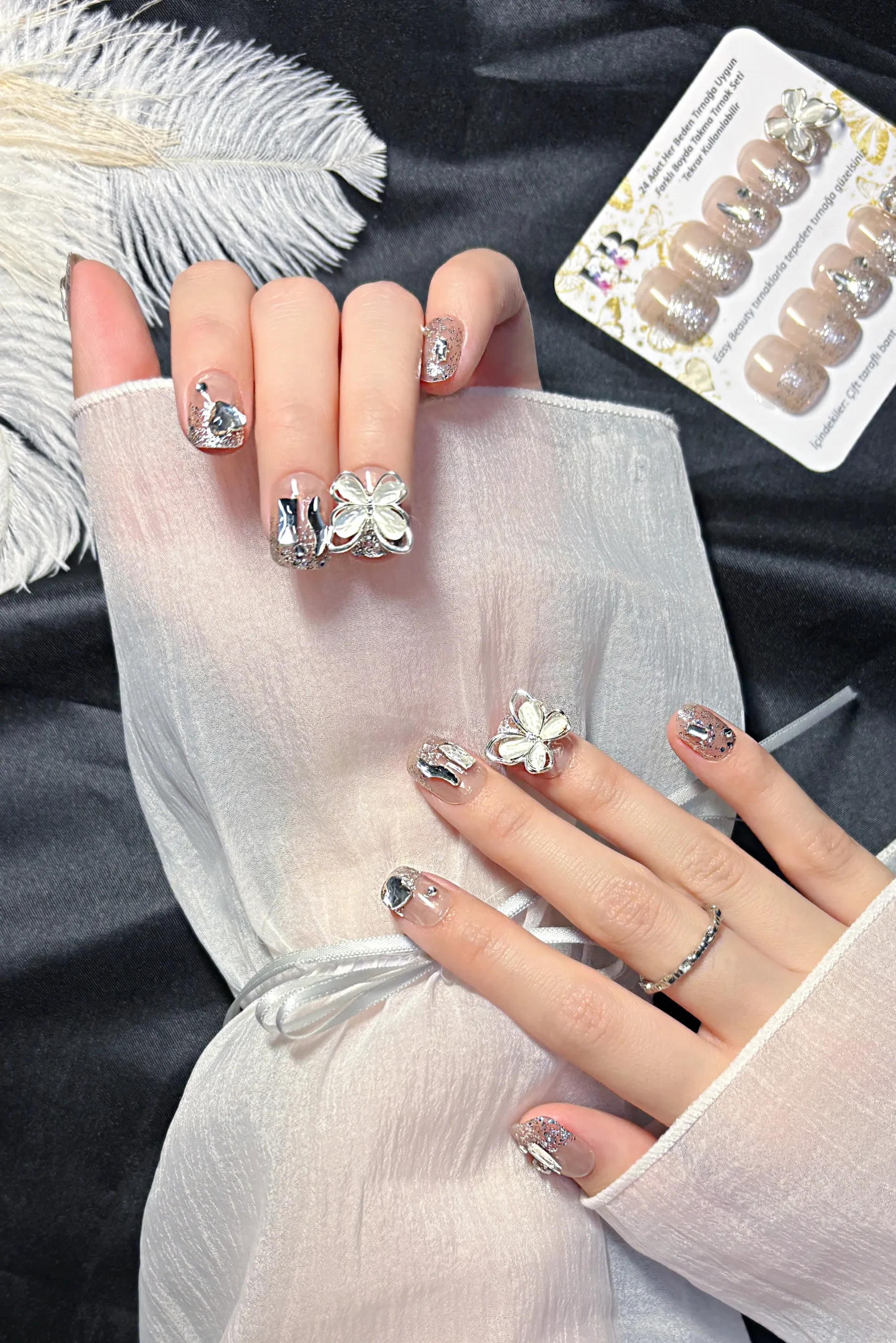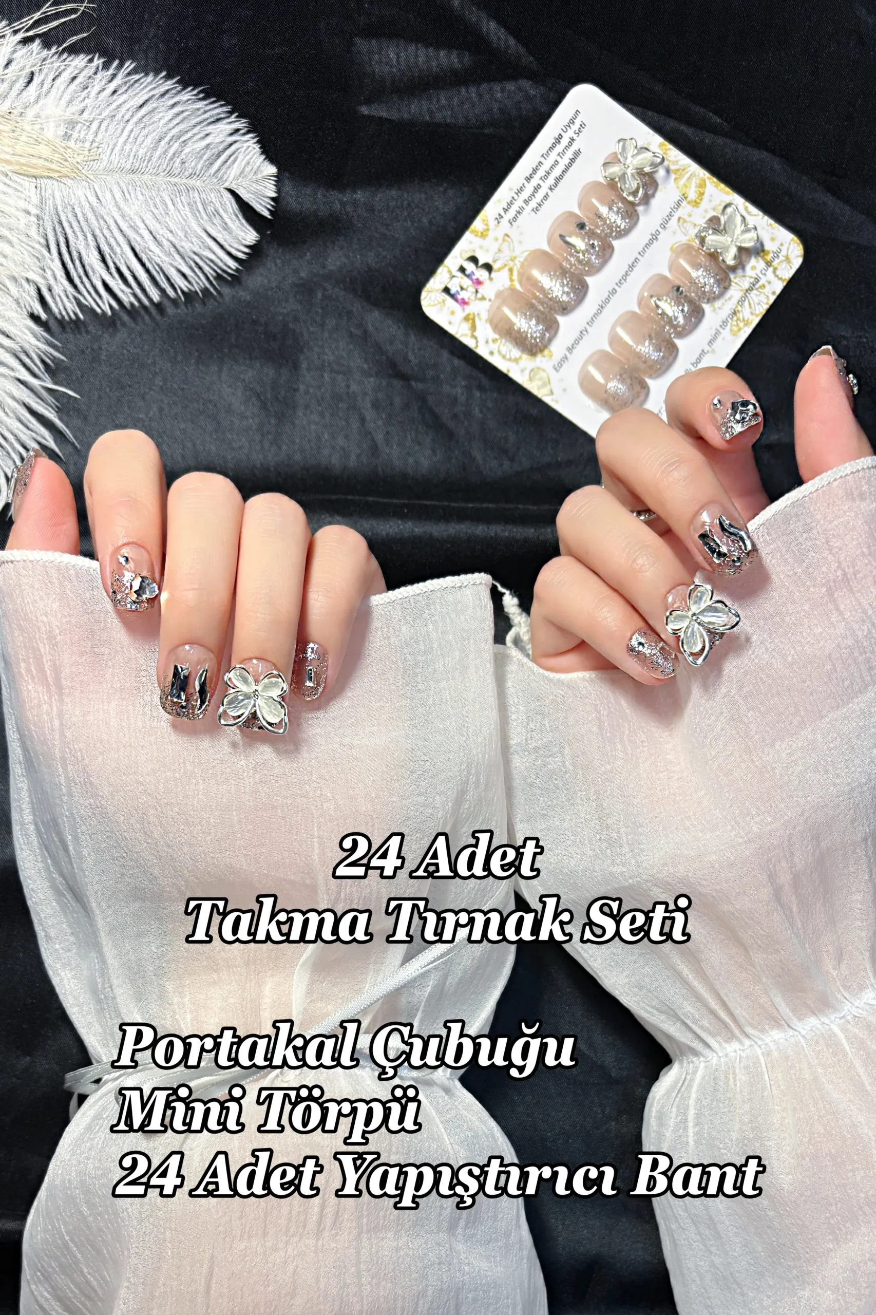 Kısa Takma Tırnak 24 Adet Kelebek Charm Taşlı Takma Tırnak Seti Z655
