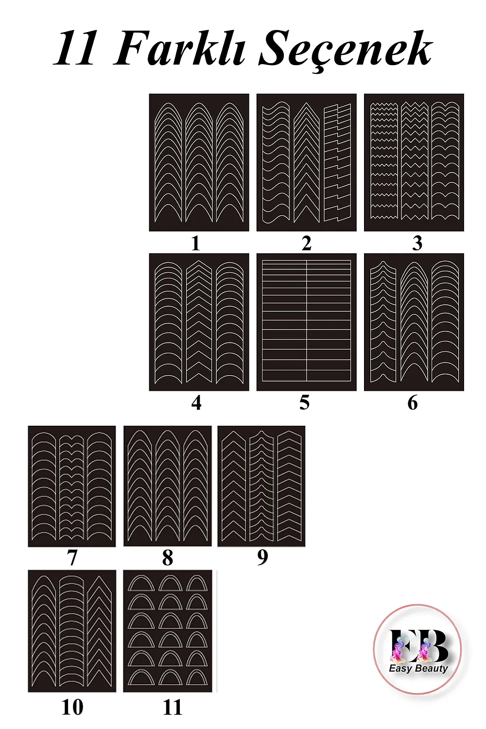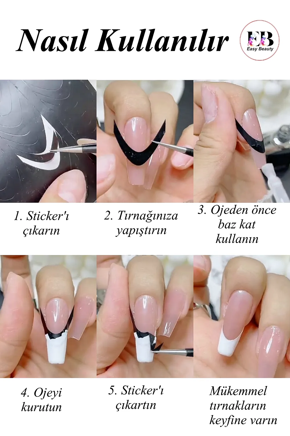 Kendinden yapışkanlı özelliği sayesinde, tırnaklarınıza kolayca uygulanır ve herhangi bir yapıştırıcıya ihtiyaç duymaz; Farklı desenlerdeki sticker seçenekleriyle tırnaklarınıza kişisel bir dokunuş ekleyerek, benzersiz ve şık tırnak tasarımları oluşturabilirsiniz; Tırnak dövmesi olarak da bilinen bu stickerlar, tırnak süsleme sanatında yeni bir boyut sunar ve nail art projelerinizde yaratıcılığınızı sergilemenize olanak tanır; Tırnak süslemede salon kalitesini ev konforunda yaşayın; [Neden Easy Beauty] Easy Beauty sticker’lar kendinden yapışkanlıdır ve herhangi bir yapıştırıcı olmadan rahatlıkla kullanılabilir.; Uygun teknikler kullanıldığı taktirde haftalarca kullanılabilir; [Nerede Kullanılır] Easy Beauty sticker’ları nail art (tırnak süsleme) için kullanabildiğiniz gibi kendinden yapışkanlı olduğu için vücudunuza veya telefon, defter, bilgisayar gibi yüzeylere de kolaylıkla uygulayabilirsiniz; [Nasıl Kullanılır] Tırnağınıza uygulayacaksanız öncelikle tırnak yüzerinizi kağıt törpü ile törpülemenizi tavsiye ederiz.; Takiben tırnak yüzeyinizi temizleyin ve base coat uygulaması yapın.; Şimdi herhangi bir yapıştırıcı kullanmadan Easy Beauty sticker’ı rahatlıkla tırnağınıza yapıştırabilirsiniz.; Üzerine top coat sürdüğünüz taktirde 2-3 hafta rahatlıkla kullanabilirsiniz.