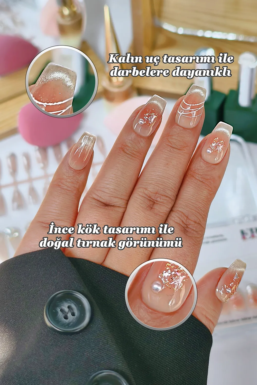 [Akıllı Tasarım] Tırnakların kök tarafının ince dizaynı sayesinde gerçek tırnağa yakın bir görünüm elde edersiniz. Tırnak ucunun kalın olması sayesinde ise Easy Beauty tırnaklar daha sağlamdır ve kolay kolay kırılmaz veya çatlamaz.