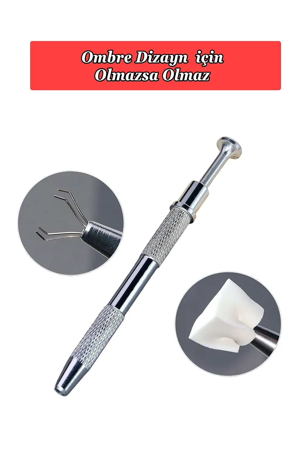 ✨ Profesyonel Ombre Efekti İçin Vazgeçilmez İkili!✨ ; Ombre Sünger: ; – Özel yapısı sayesinde yumuşak ve pürüzsüz geçişler sağlar.; ; – Çift tonlu, gradient veya ombre nail art tasarımları için idealdir.; ; – Su bazlı ojelerle uyumludur (akrilik boya veya jel ojelerle de kullanılabilir).; ; – Yıkanabilir ve tekrar kullanılabilir, ekonomik ve uzun ömürlüdür.; ; Sünger Tutucu Kalem: ; – Süngeri tutmayı kolaylaştıran ergonomik tasarım sayesinde hassas çalışma imkanı sunar.; ; – Kaymayan uç kısmıyla kontrollü boyama yaparsınız.; ; – Pratik ve hijyenik kullanım için idealdir.; ; Kullanım Talimatı: ; 1. Ombre süngerini tutucu kaleme takın.; ; 2. Seçtiğiniz iki oje rengini süngerin farklı kısımlarına damlatın (açık ton üstte, koyu ton altta olmalı).; ; 3. Hafifçe tıklayarak tırnağa uygulayın.; Geçişler için 2-3 kat sürebilirsiniz.; ; 4. Süngeri su ve sabunla temizleyip kurutarak tekrar kullanın.