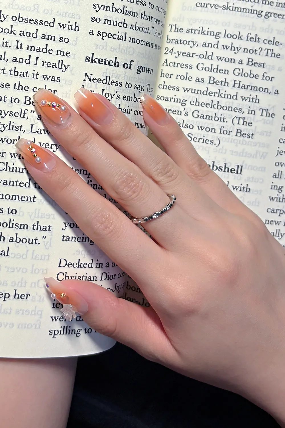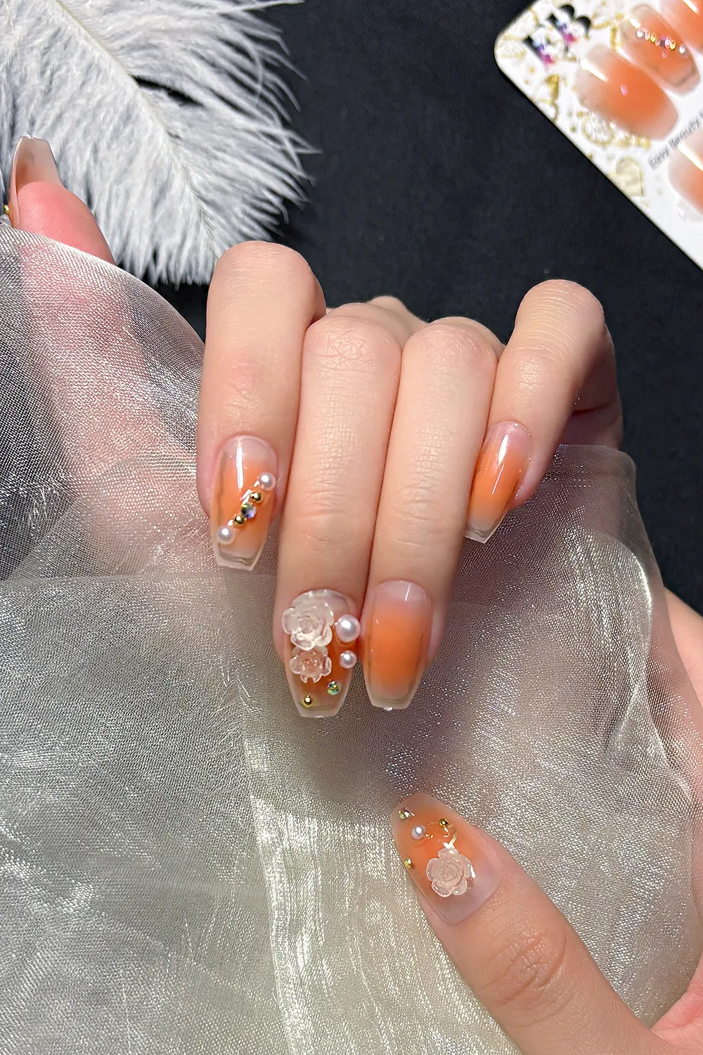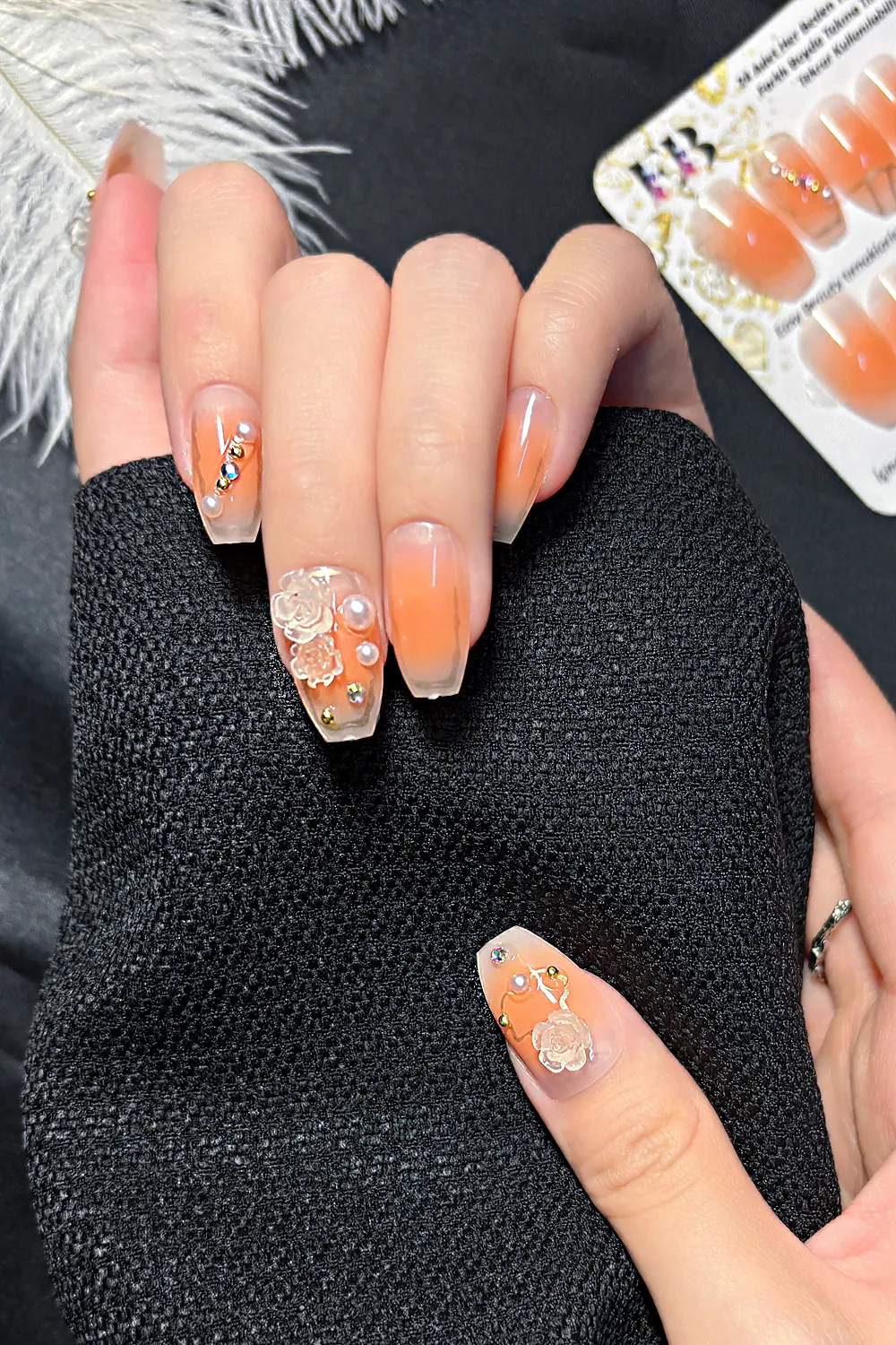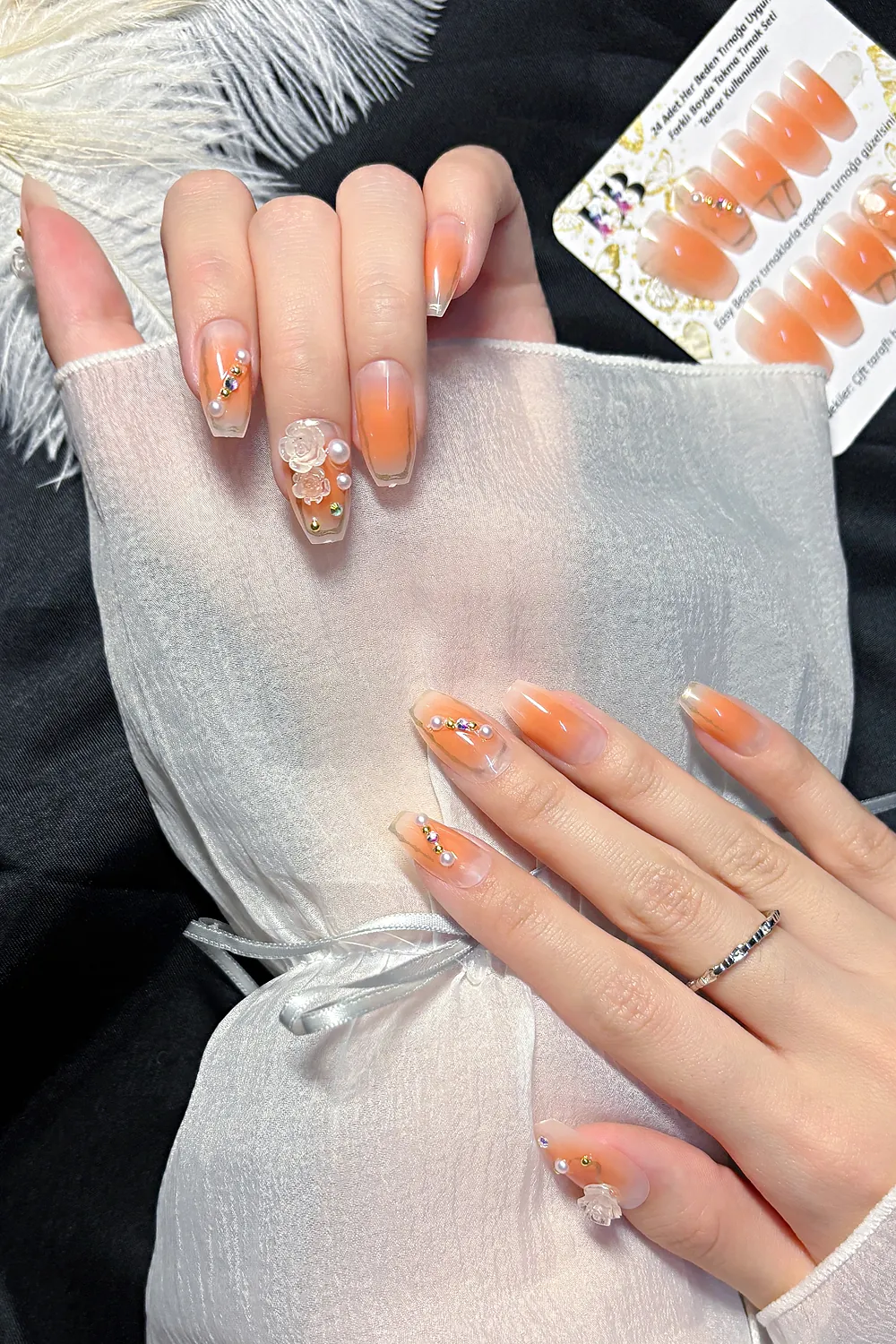 Ombre Takma Tırnak Balerin İnci Taneli Orta Uzun 24 Adet Takma Tırnak Seti Z402