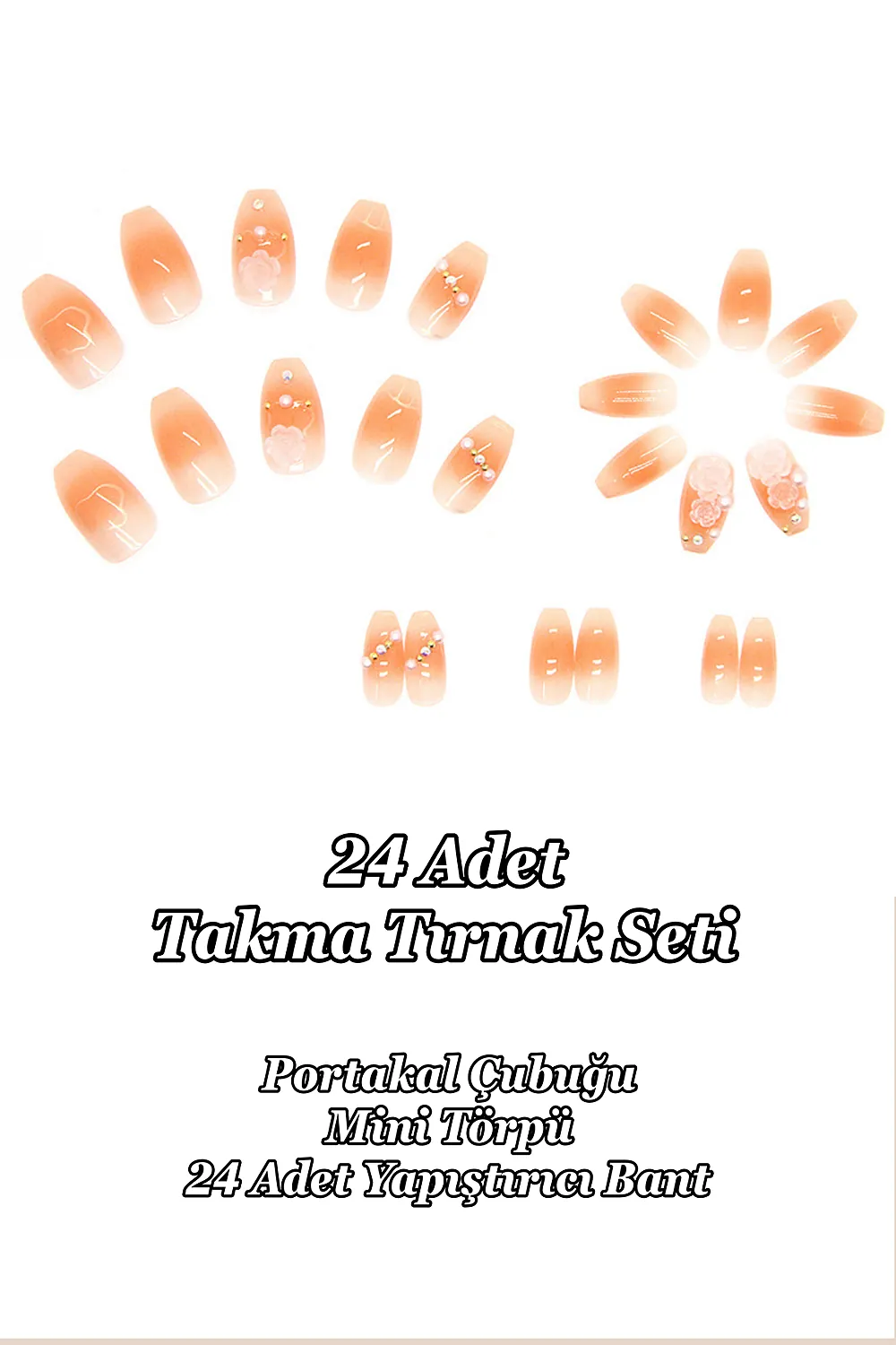 Kutu içerisinde 24 adet takma tırnak, 24 adet çift taraflı yapıştırıcı, manikür çubuğu (portakal çubuğu ve mini törpü bulunmaktadır.