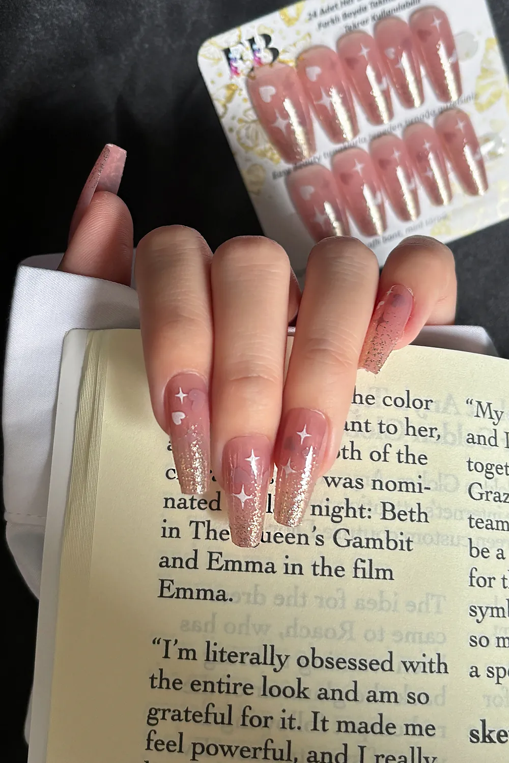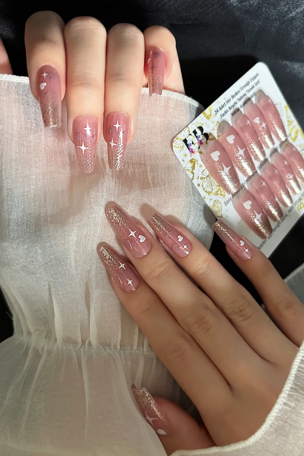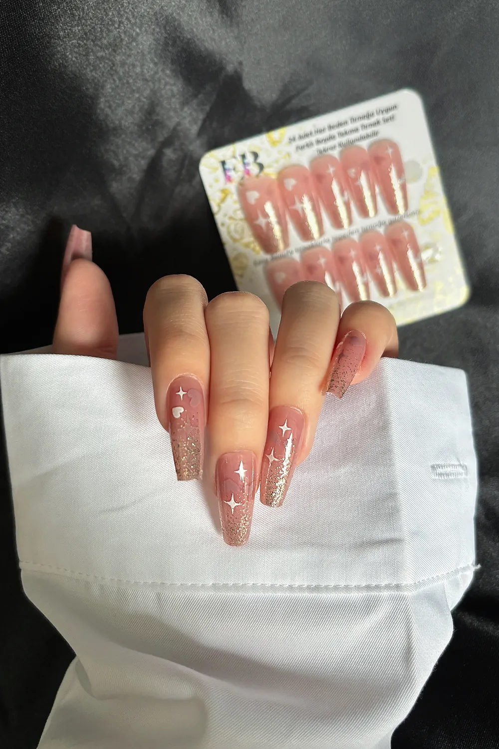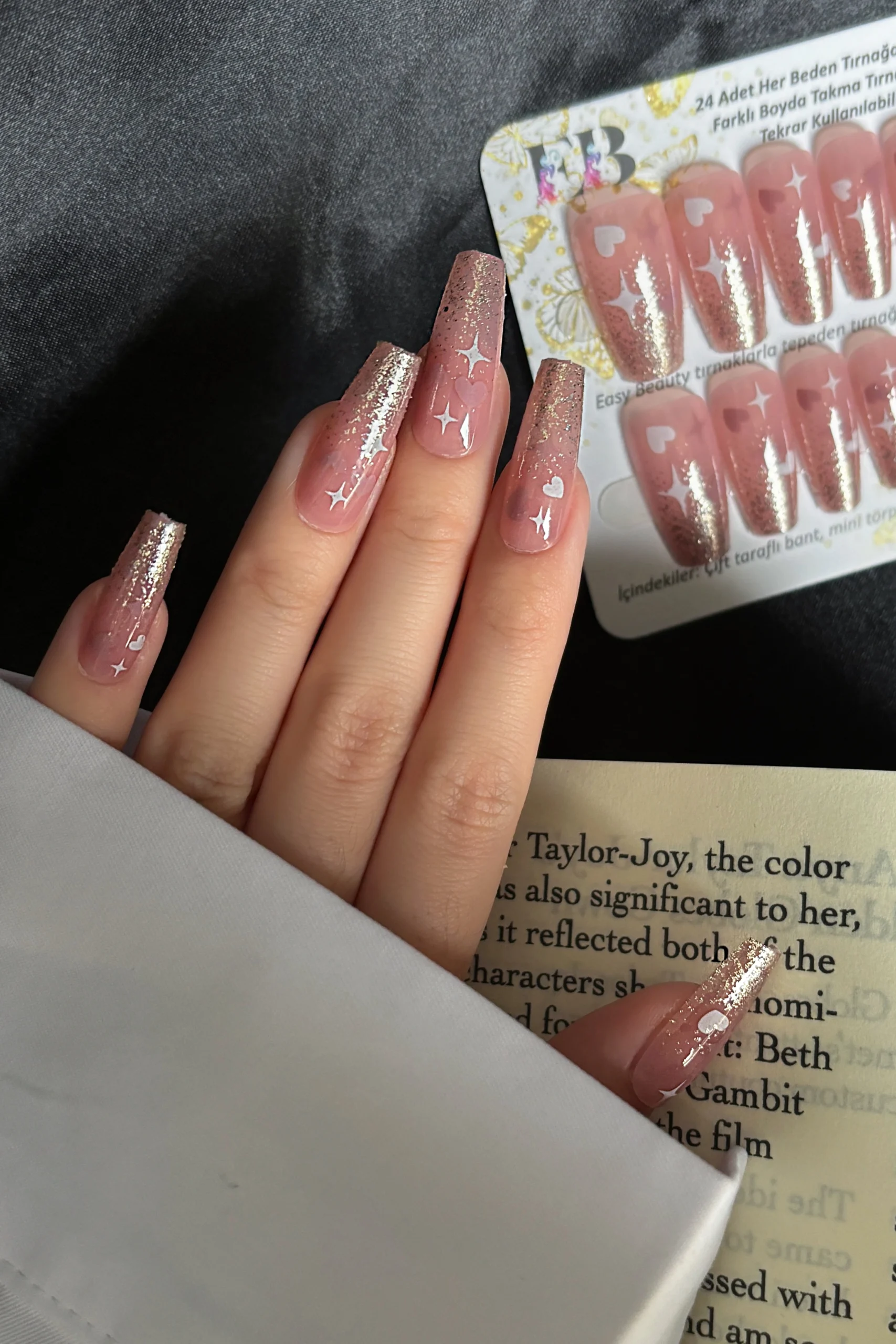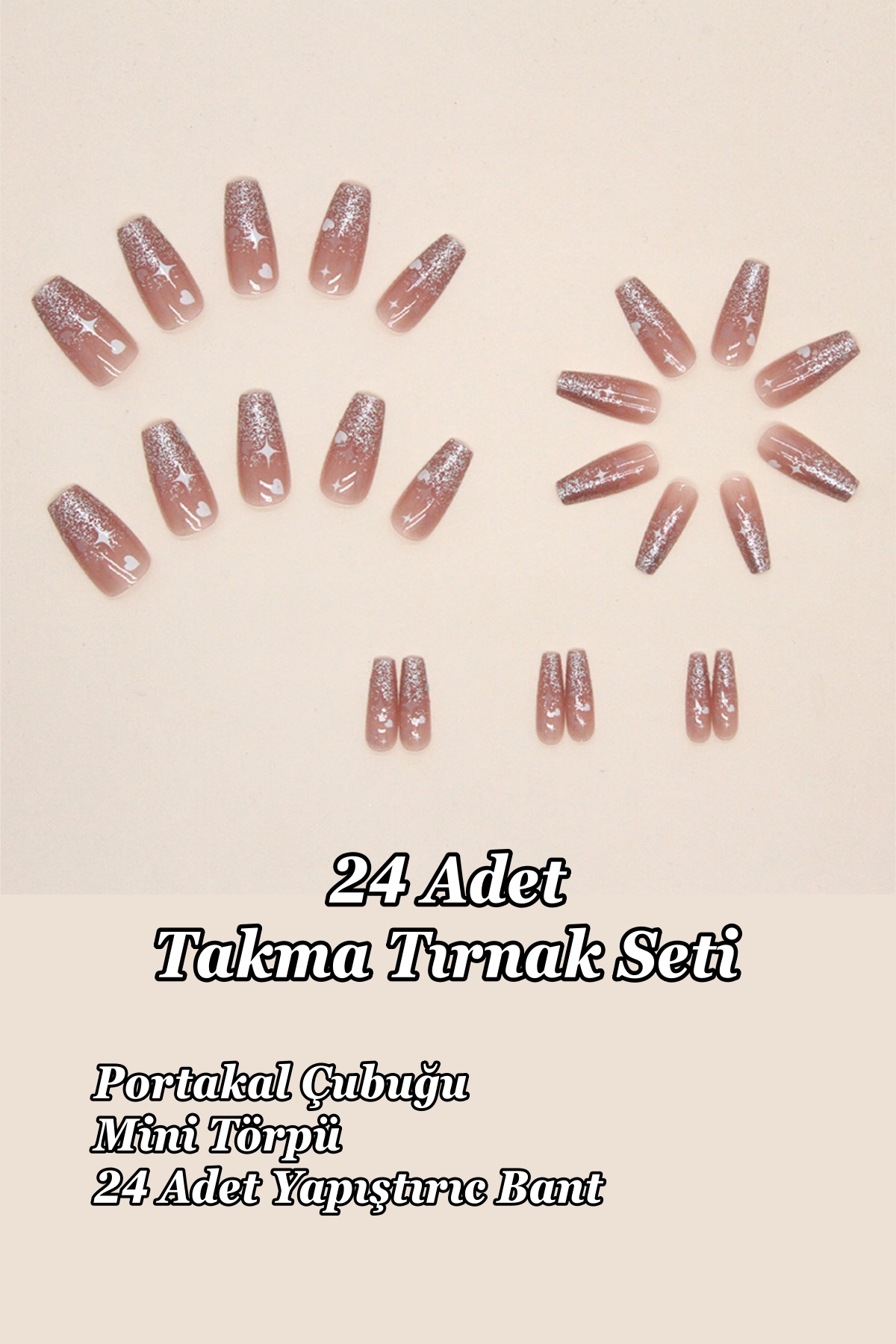Orta Küt 24 Adet Takma Tırnak Seti Simli ve Yıldızlı Tırnak R737