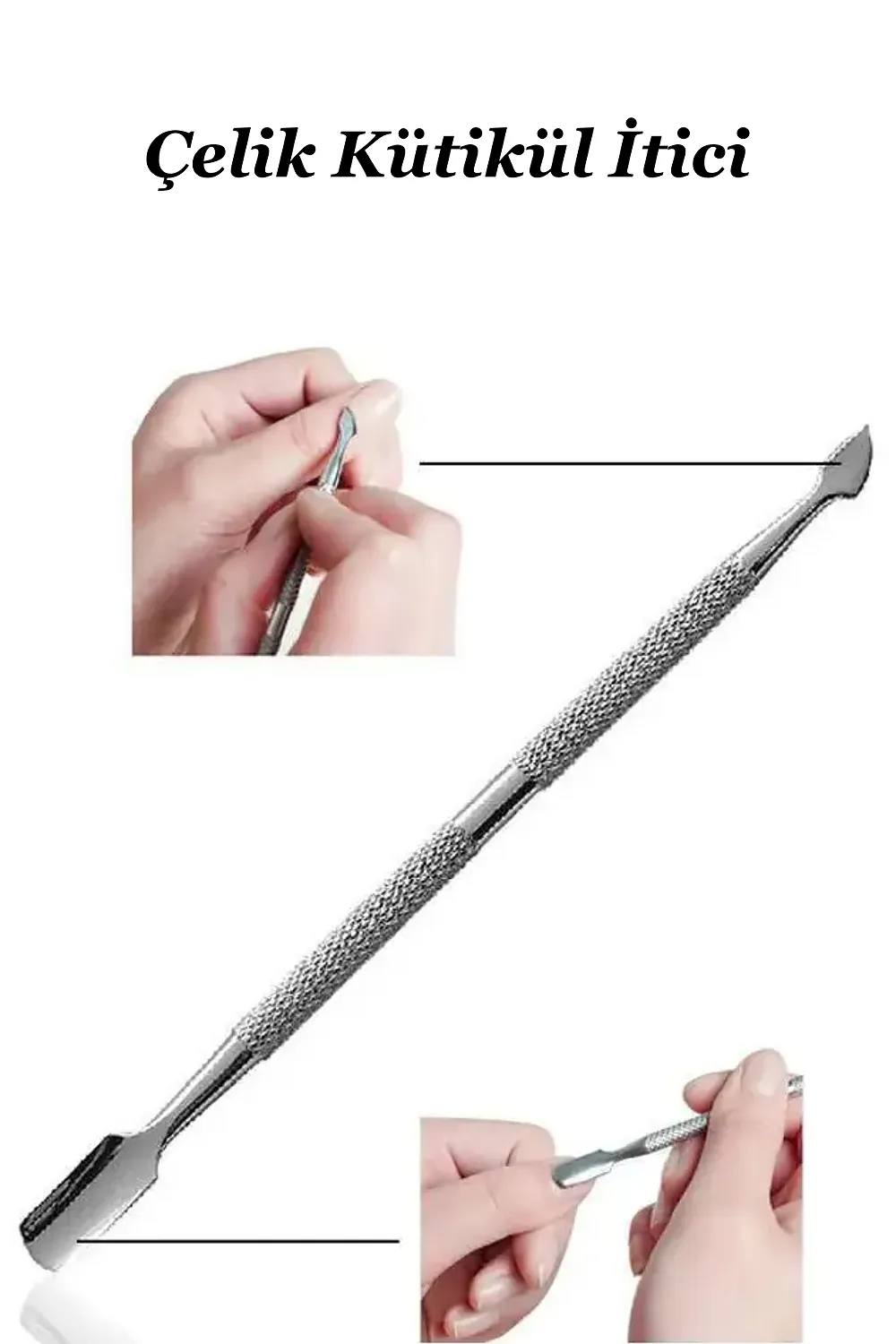 Paslanmaz Çelik Kronk Tırnak Eti Itici Ve Oje Çıkarıcı. Çelik çift uçlu tırnak eti itici, paslanmaz çelikten yapılmış, iki uçlu bir manikür-pedikür aracıdır. Bir ucu tırnak etlerini geri itmek için, diğer ucu ise tırnakların altındaki ölü deri ve kirleri temizlemek için kullanılır. Çelik çift uçlu tırnak eti iticinin özellikleri şunlardır: Paslanmaz çelikten üretilmiştir, bu nedenle uzun ömürlü ve dayanıklıdır.