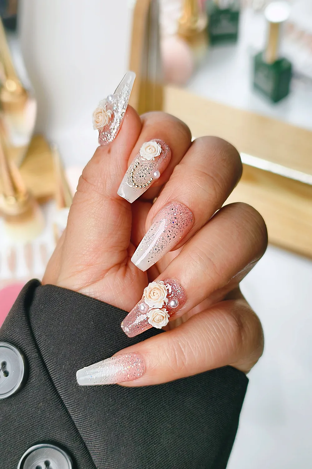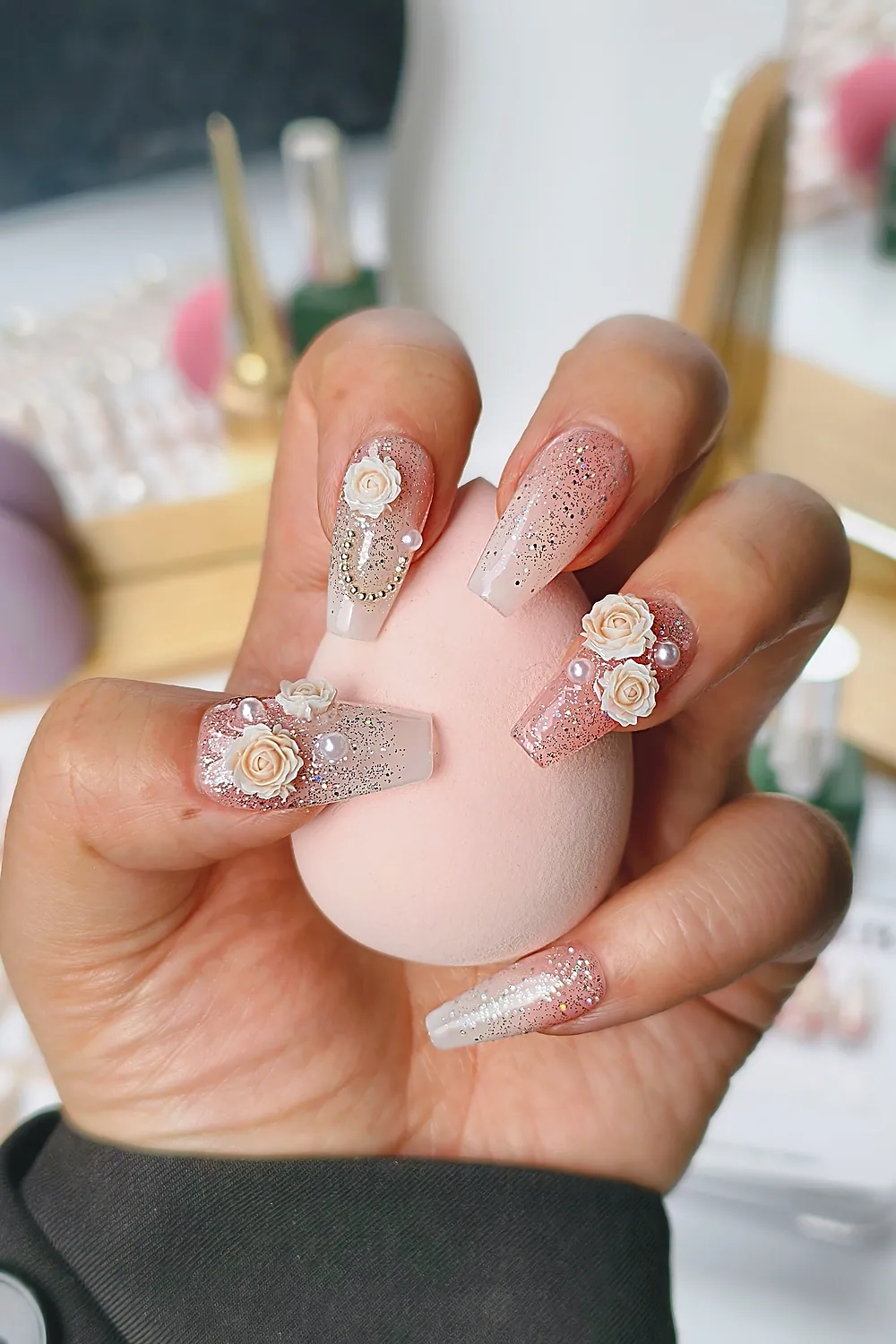 Protez Tırnak Çiçek Desenli 10 Adet El Yapımı Takma Tırnak Seti 3404