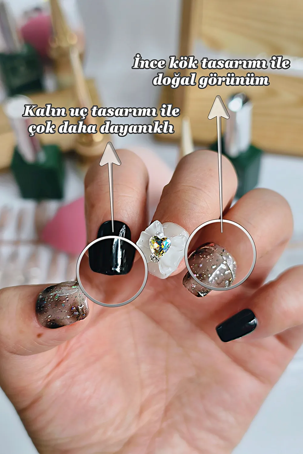 [Akıllı Tasarım] Tırnakların kök tarafının ince dizaynı sayesinde gerçek tırnağa yakın bir görünüm elde edersiniz. Tırnak ucunun kalın olması sayesinde ise Easy Beauty tırnaklar daha sağlamdır ve kolay kolay kırılmaz veya çatlamaz.