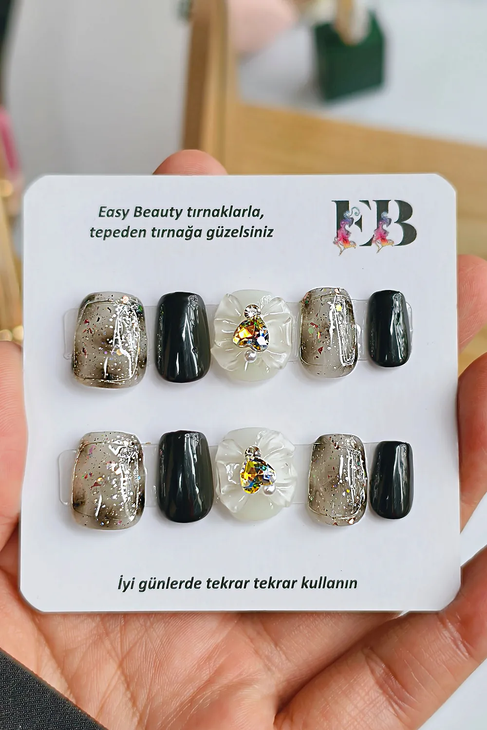 [Neden Easy Beauty] Easy Beauty takma tırnakları seçmeniz için en önemli neden ise resimde gördüğünüz ürünü satın alacak olmanızdır. Yani, burada gösterilen fotoğraflarda ya da videolarda herhangi bir oynama yapılmamıştır. Fotoğraf ve videolar Easy Beauty markası tarafından üretilmiştir, başka bir yerden kopyalanmamıştır.