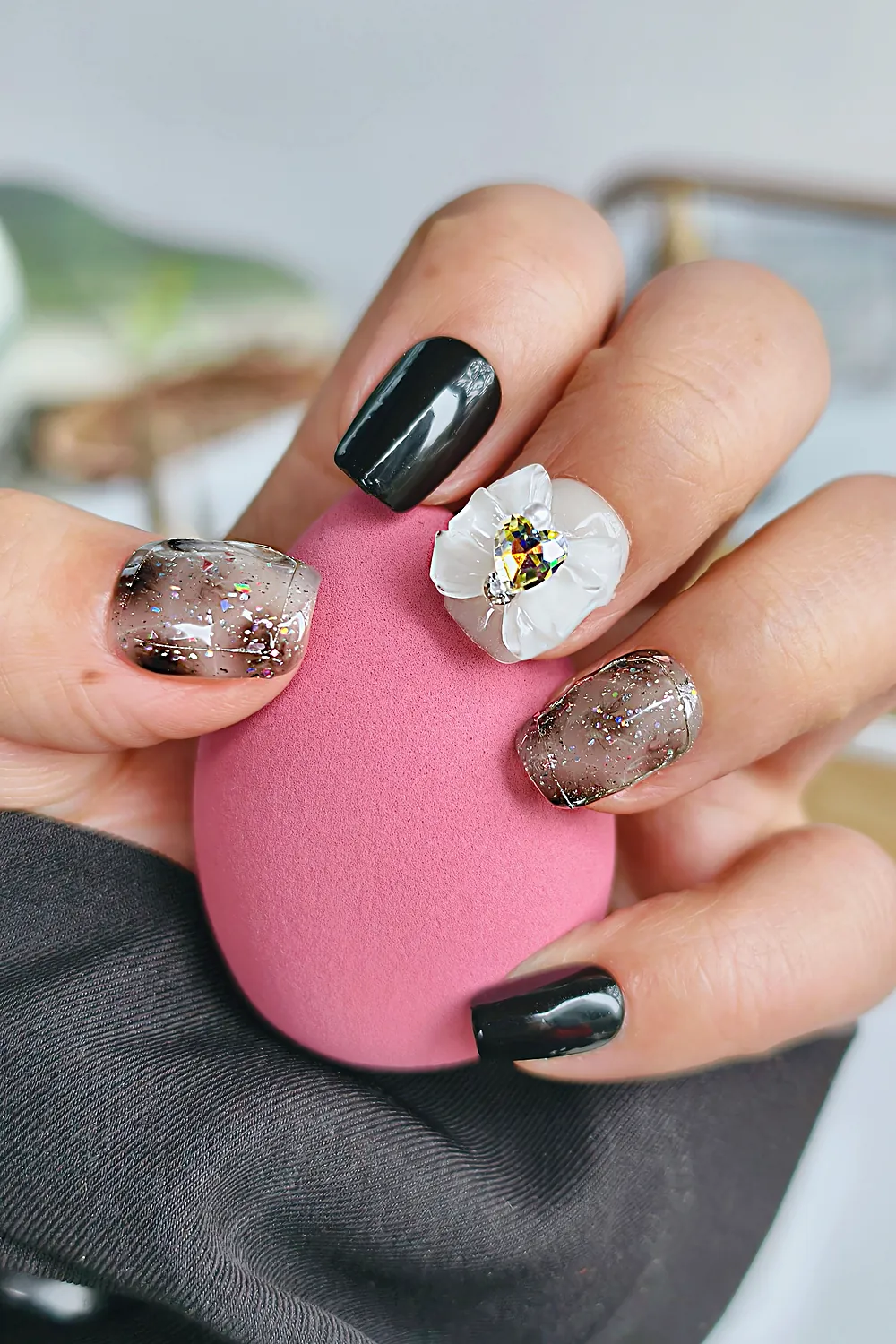 Simli Siyah Beyaz Protez Tırnak 10 Adet El Yapımı Takma Tırnak Seti 2201