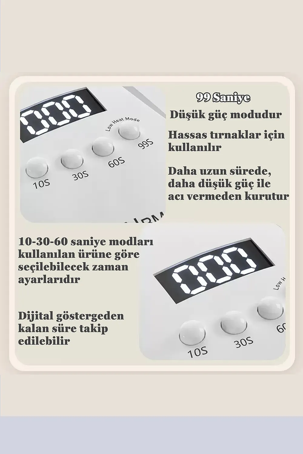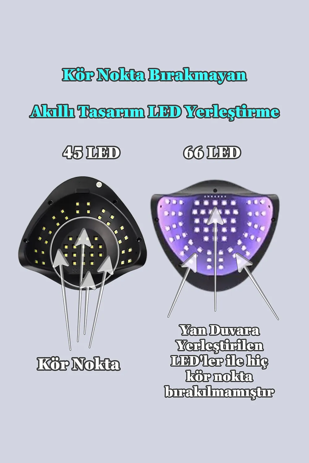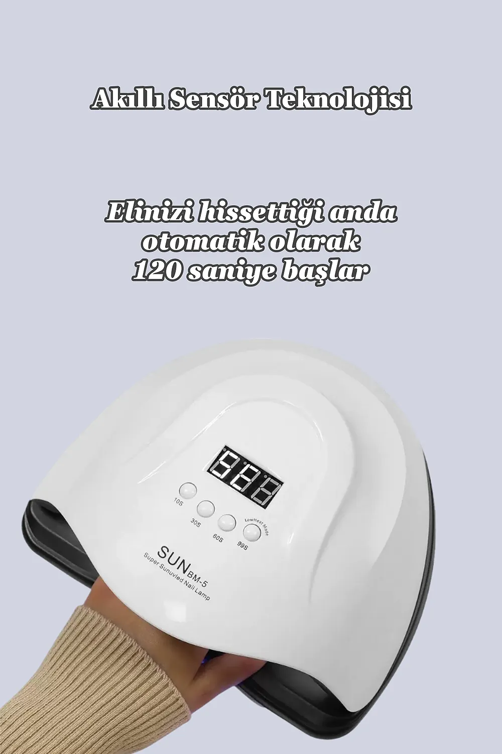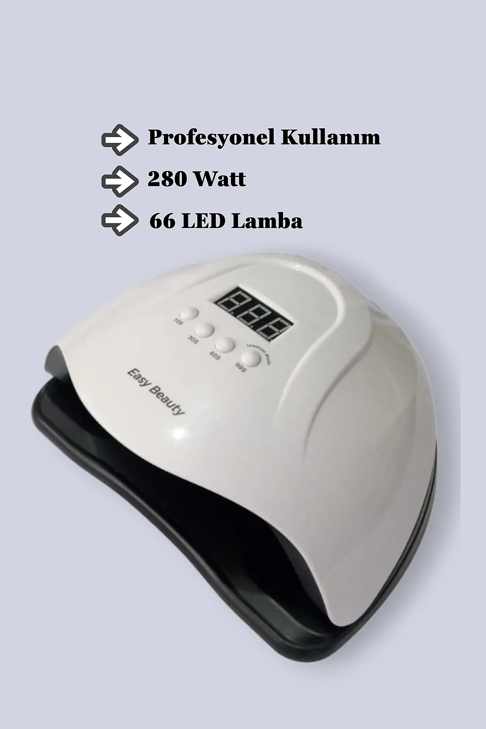 Profesyonel UV LED Kalıcı Oje Protez Tırnak Kurutucu; 66 adet stratejik olarak yerleştirilmiş LED lamba ile kör nokta kalmaz ; 280 W çıkış gücü sayesinde her türlü kalıcı oje için uygundur.; ; Zaman ayarlaması için lütfen oje üreticisi ile görüşünüz.; ; Akıllı sensör sayesinde kullanımı kolaydır.; ; Otomatik sensör 120 saniyeye ayarlıdır.10-30-60 ve 99 olmak üzere seçilebilir 4 zaman fonksiyonu vardır.; ; Kalan zaman dijital olarak gösterilir.; ; Eğer tırnaklarınız çok hassas ise 99 saniye fonksiyonunu seçmeniz tavsiye edilir.; Bu zaman ayarında cihaz düşük güç modunda çalışır ve tırnaklarınız acımaz.; Ancak ojenin içeriğine göre kuruması için 2 kere kullanmanız gerekebilir.; ; UV lamba güneş ışığı gibi cildinizin bronzlaşmasına sebep olabilir.; Bu nedenle UV koruyucu eldiven ve parmak bandı ile ya da GÜNEŞ KREMİ ile kullanmanız tavsiye edilir.; ; LED ömrü 50.000 saattir.; ; UV kurutucu sadece kalıcı oje için uygundur.; Normal oje ile kullanılmaz.; UV kurutucu alt panelinden ayrılarak ayaklar için de kullanılabilir.; ; Ürün temizliğinde kesinlikle sıvı kullanmayınız.; Cihazı tek seferde 600 saniyeden fazla kullanmayın.
