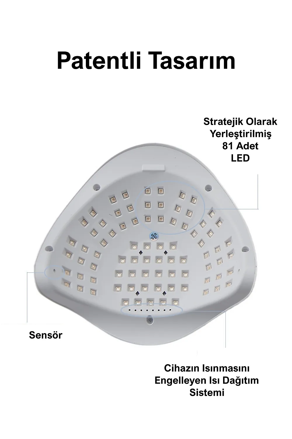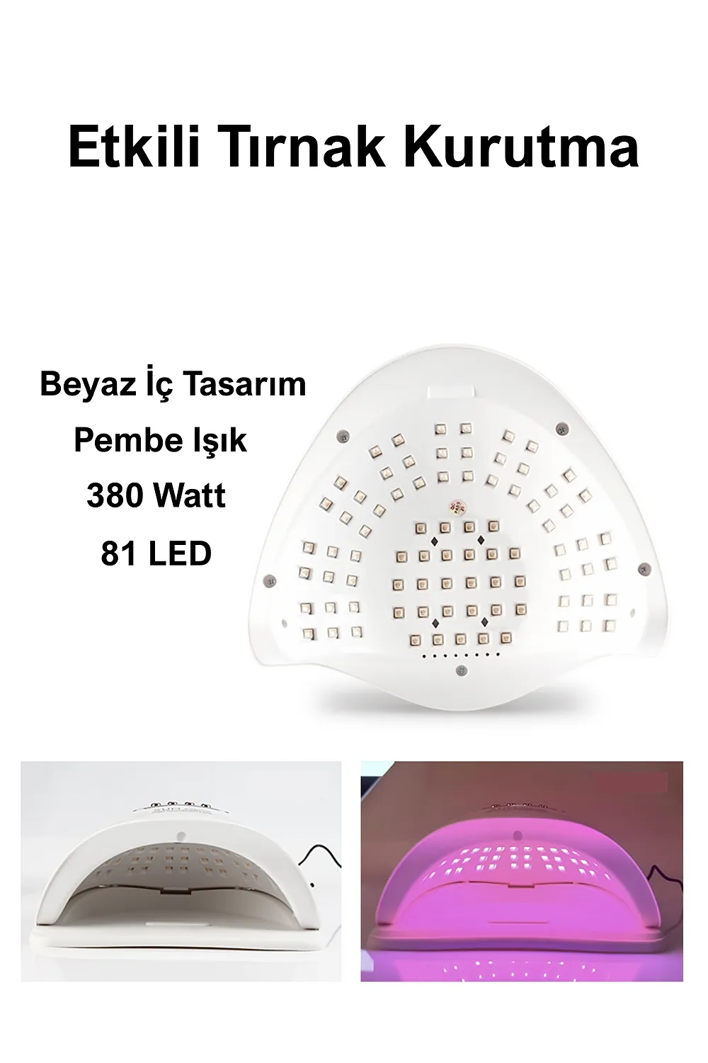 Profesyonel UV LED Kalıcı Oje Protez Tırnak Kurutucu; 72 adet stratejik olarak yerleştirilmiş LED lamba ile kör nokta kalmaz ; 320 W çıkış gücü sayesinde her türlü kalıcı oje için uygundur.; ; Zaman ayarlaması için lütfen oje üreticisi ile görüşünüz.; ; Akıllı sensör sayesinde kullanımı kolaydır.; ; Otomatik sensör 120 saniyeye ayarlıdır.10-30-60 ve 99 olmak üzere seçilebilir 4 zaman fonksiyonu vardır.; ; Kalan zaman dijital olarak gösterilir.; ; Eğer tırnaklarınız çok hassas ise 99 saniye fonksiyonunu seçmeniz tavsiye edilir.; Bu zaman ayarında cihaz düşük güç modunda çalışır ve tırnaklarınız acımaz.; Ancak ojenin içeriğine göre kuruması için 2 kere kullanmanız gerekebilir.; ; UV lamba güneş ışığı gibi cildinizin bronzlaşmasına sebep olabilir.; Bu nedenle UV koruyucu eldiven ve parmak bandı ile ya da GÜNEŞ KREMİ ile kullanmanız tavsiye edilir.; ; LED ömrü 50.000 saattir.; ; UV kurutucu sadece kalıcı oje için uygundur.; Normal oje ile kullanılmaz.; UV kurutucu alt panelinden ayrılarak ayaklar için de kullanılabilir.; ; Ürün temizliğinde kesinlikle sıvı kullanmayınız.; Cihazı tek seferde 600 saniyeden fazla kullanmayın.