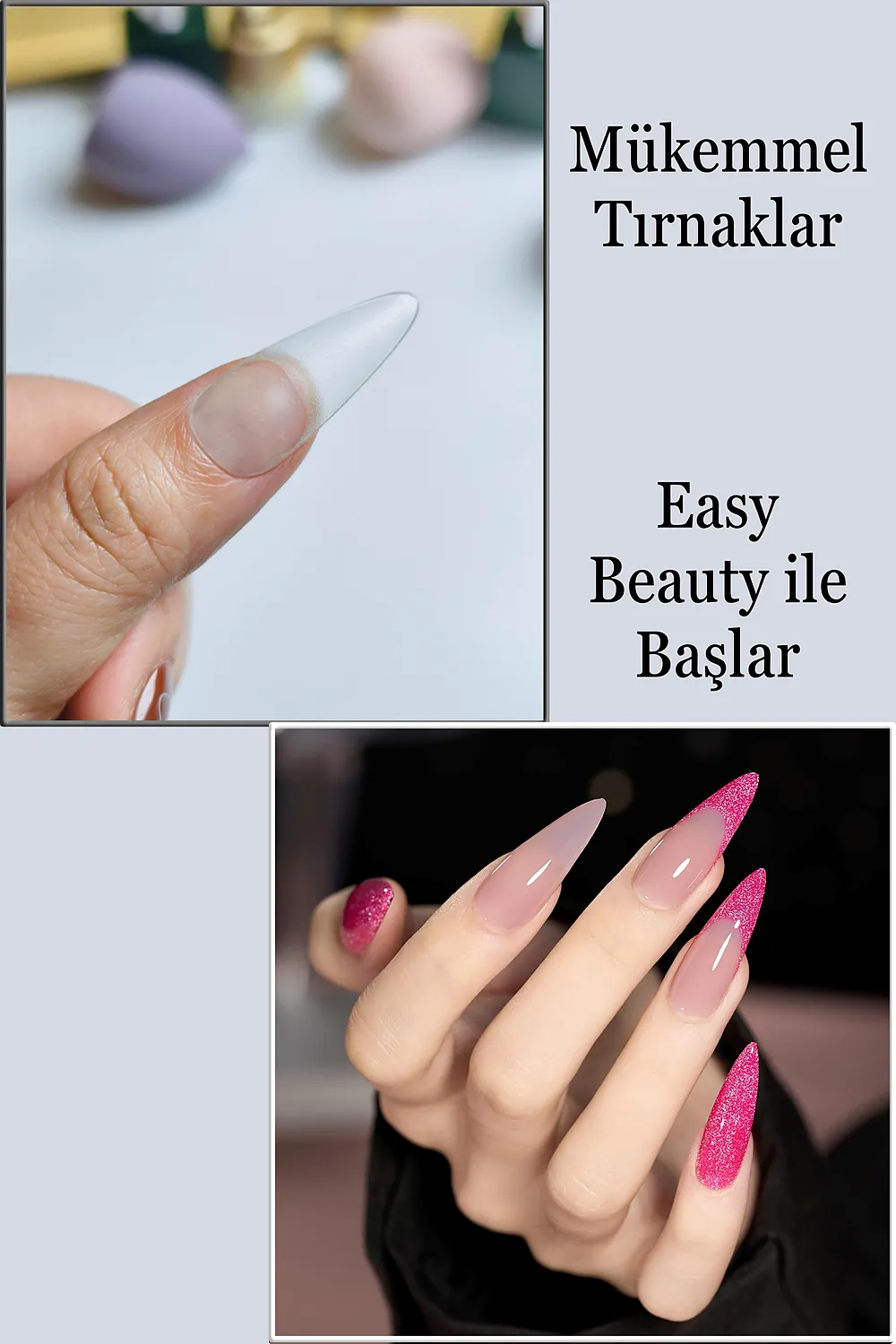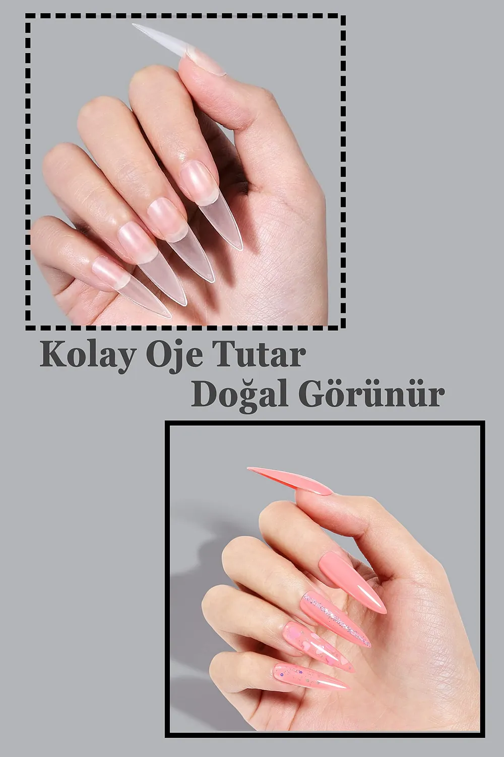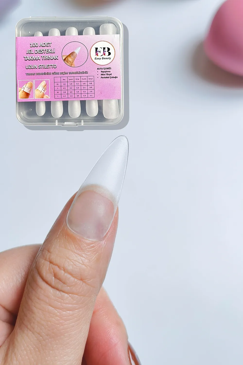 [Esnek Yapıda] Yeni nesil EASY BEAUTY jel tırnaklar tırnağınıza tam oturur ve Uzun süreli kullanılabilir.; Esnek jel tırnaklar tırnağınızı tam kaplar.; [Önceden Törpülenmiş] Normalde takma tırnakların Uzun süreli kullanılabilmesi ve daha iyi yapışması için kullanılmadan önce iç taraflarının törpülenmesi gerekmektedir.; Mat (önceden törpülenmiş) dizaynı sayesinde EASY BEAUTY jel tırnakları törpülemeye ihtiyaç duymadan kullanabilirsiniz.; [AkıllıTasarım] Tırnak köküne gelen kısmı daha ince dizayn edildiği için gerçek tırnağınız gibi görünür.;; [Daha Dayanıklı] EASY BEAUTY jel tırnakların uç tarafı daha kalın üretildiği için darbe aldığında kolay kolay kırılmaz; [Kolay Oje Tutar] Tırnakların dış yüzeyi de mat dizayn edilmiştir.; Bu sayede oje sürüldüğünde renk dağılımı daha iyi ve homojen olur ve gerçek tırnağa yakın bir görünüm sağlanır.; [Tam Size Göre] S, M, L olmak üzere toplam 3 boyutta üretilmiştir.; Tırnağınıza uygun boyutta olan EASY BEAUTY jel takma tırnakları seçin (uygun boyutun nasıl seçilmesi gerektiğini fotoğraflarda bulabilirsiniz).; [Harcarken Kazandırır] Her kutu içerisinde 5 farklı boyutta ve her boyuttan 20 adet olmak üzere toplam 100 adet tırnak tipsi vardır.; Tırnağınıza uygun boyutu doğru belirlediğiniz taktirde kutu içerisindeki tüm tırnakları kullanabilirsiniz ve harcadığınız para boşa gitmez.; 100 tırnağın 100’ü de tam size göre.; ; [Kullanımı Kolaydır] EASY BEAUTY yeni kutulama şekli sayesinde tırnak tipslerinizi kolaylıkla bulabilirsiniz.; [Dayanıklı Paketlenmiştir] Diğer takma tırnak tipslerinin kutusu yumuşak plastiktir ve kargoda çatlama, kırılma ve tırnakların hepsinin birbirine karışması gibi sorunlar yaşanmaktadır.; Bu şekilde satılan diğer markaların yorumlarını inceleyebilirsiniz Easy Beauty tırnak tipslerinin kutusu sert plastikten üretildiği için bu sorunların yaşanma ihtimali çok daha düşüktür ve siparişinizi aldığınızda hayal kırıklığına uğramazsınız ;